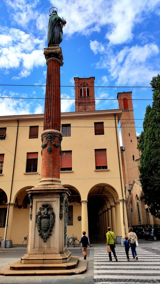 Nun aber endgültig zackzack zur wenige Minuten entfernten Piazza Maggiore. Die Ausflugsgruppe fand sich nach und nach ein. Nur eine Person fehlte. Wir warteten und machten uns schließlich ohne den verlorenen Sohn auf den Weg zur Basilica di San Francesco. Unser Ausflugsbus rollte langsam heran und siehe da – der Verlorengegangene traf ein. Die auf der Säule stehende unbefleckte Empfängnis (Colonna dell'Immacolata)
