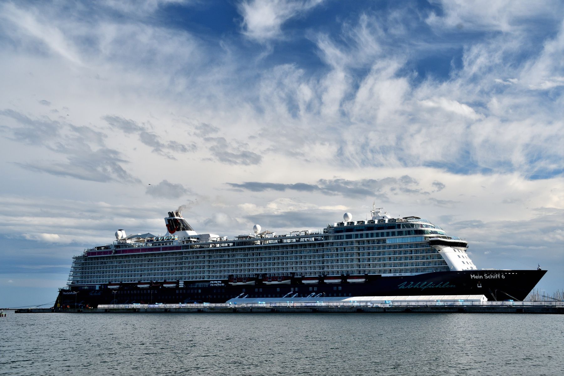 Wir gönnten uns einen längeren Strandspaziergang, zwischendurch mit den Füßen im Wasser. Dabei hatten wir immer unser Mein Schiff 6