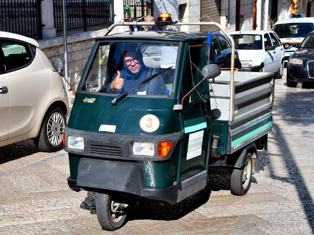 Ein Piaggio Ape – dem Fahrer gefiel offensichtlich, dass er in seinem fahrbaren Untersatz fotografiert wurde.