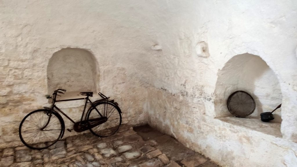 Nun allgemein zu den Trullis, aus dem Griechischen übersetzt Kuppeln: Bei Ausgrabungen wurde festgestellt, dass Menschen bereits in der Bronzezeit diese Bauart kannten. Die früheren Häuser der Armen wurden vermehrt ab dem 13./14. Jahrhundert hochgezogen. Sie entstanden quasi als Steuersparmodell. Einem gewissen Graf von Conversano wurde aufgrund seiner Verdienste ein Landstrich zugewiesen. Ein richtiger Schlickefänger, das Königreich Neapel als Landspender – denn für die auf Grund und Boden fest stehenden Häuser mussten ihm Steuern entrichtet werden. Aber kein Problem – der Graf schlug den Spender mit eigenen Waffen. Er wies seine Untergebenen an, nur noch Häuser in Trockenbauweise zu bauen. Wenn ein Steuereintreiber gesichtet wurde, konnten die Trullis blitzschnell dem Erdboden gleichgemacht werden und – kaum war er weg – wieder in den vorherigen Zustand versetzt werden. Die Trulli hatten weitere Vorteile: Die Häuser waren stabil, die Mauern waren dick und boten im Sommer Schutz vor der südländischen Hitze und sie hielten im Winter die Wärme des offenen Kamins.