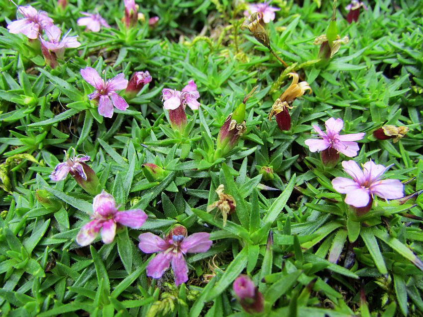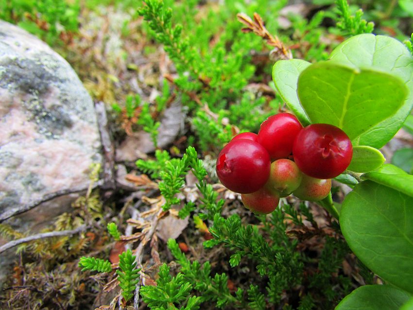 Hier zwischen "Stock und Stein" gibt es jede Menge zu entdecken - die kleinen Dinge, die sich ein Stück Lebensraum unter schwierigen Bedingungen erobert haben. An den geschützten Hängen des Talkessels sind die Bäume höher. Hier inmitten dieser "Geröllwüste" klammern sich zwar etliche, aber dafür arg "gebeutelte" Bäumchen an das wenige, was sie hier zum Wurzeln finden. Überwiegend sind es Birken mit verkrüppelten und bemoosten Stämmchen, die es hier "wie Sand am Meer" gibt. Dazwischen aber auch immer wieder kleine Pflänzchen mit bunten Blüten oder leuchtenden Beeren, auch mal ein kleiner Pilz, Heide, Moose, Flechten.
