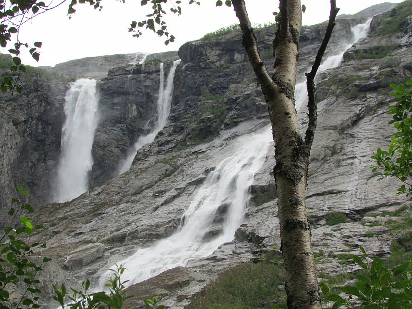 Durch ein wildromantisches Tal geht es auf schmalen Straßen zunächst wieder bis zum Lovatnet. Ab da fahren wir steil bergauf. Es ist sehr steil. Die Straße ist extrem eng und der Abgrund neben der schmalen Straßenbegrenzung seeeehr tief. Mein lieber Mann! Da war die gestrige Serpentinenfahrt auf der Stalheimstraße ja die reinste Erholung!