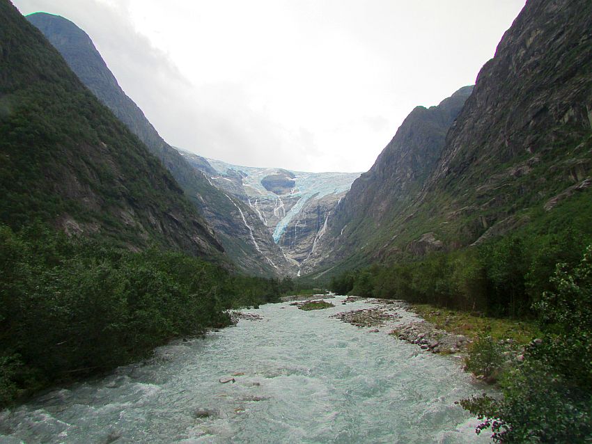 Schließlich kommt unser Bus wieder angerollt, wir steigen ein und es geht - zunächst über die schmale Brücke - danach auf spektakulärer Strecke zurück in Richtung Olden. Ein letzter Blick auf den Kjenndalsbreen. Mach´s gut, Gletscher! Wenn ich dich eines Tages mal wieder besuche, hast du dein eiskaltes Antlitz sicherlich verändert. Und ich befürchte, die Veränderung wird dramatisch sein … Gedanken, die mich trotz der Schönheit dieser Landschaft an diesem Tag auch sehr nachdenklich machen …
