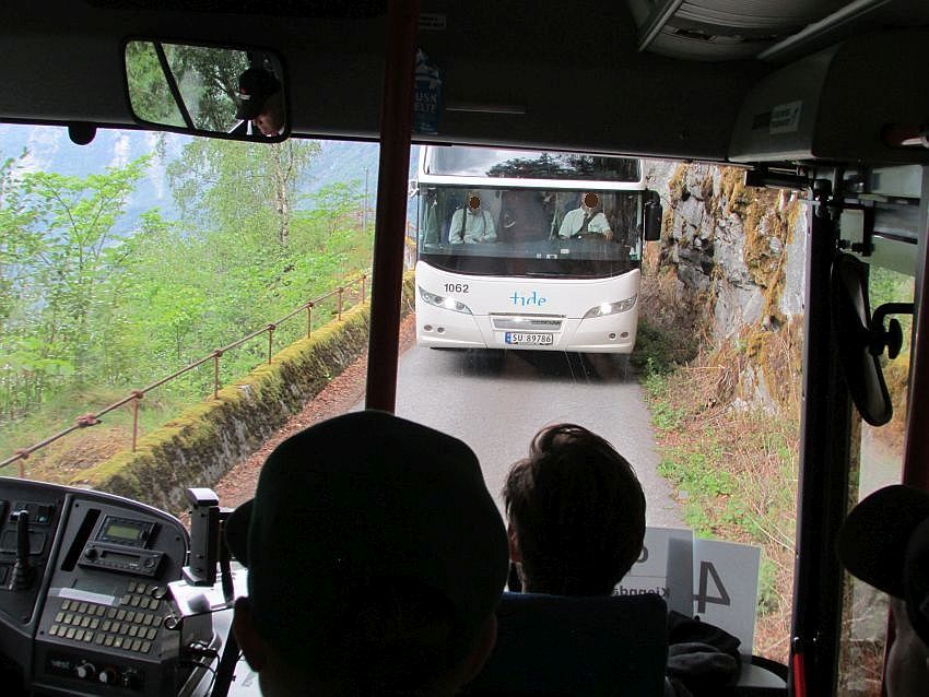 Und dann ist da plötzlich ein Bus. Auf Gegenkurs! In einer Kurve! Tja, und nun?! Norwegische Busfahrer sind extrem umsichtig. Der Fahrer des bergan fahrenden Busses rollt langsam rückwärts. Das ist natürlich erst möglich, als sich die hinter ihm fahrenden PKWs ebenfalls rückwärts bewegt haben. Irgendwann kommt eine Ausbuchtung und in wahrer Millimeterarbeit und mit eingeklappten Außenspiegeln bewegen wir uns im Schneckentempo aneinander vorbei. Ich glaube, jeder im Bus hält in diesen Momenten mehr als einmal die Luft an.