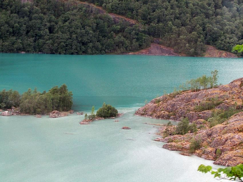 Das Ganze wirkt noch unglaublicher, wenn man bedenkt, dass wir uns in genau der Höhe befinden, bis zu der der gewaltige Tsunami von 1936 reichte. Durch die Strömungsverhältnisse in der Engstelle, die den Lovatnet in nahezu zwei Hälften teilt, bildet das Wasser unterschiedliche Farben aus: