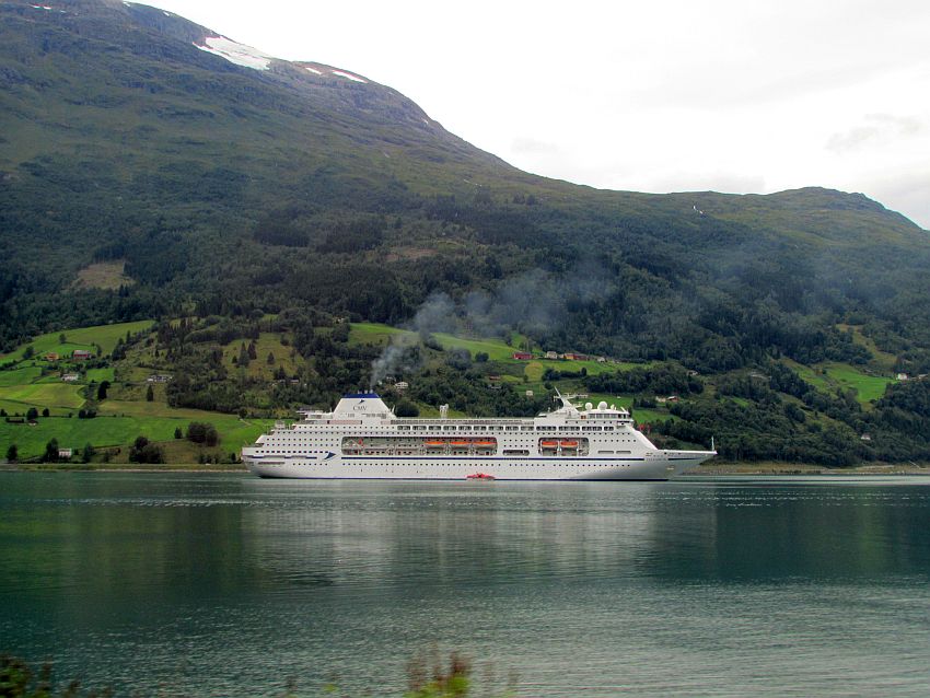 Kurz darauf erreichen wir gegen 13 Uhr wieder Olden. Im Faleidfjord ist inzwischen die "Columbus" vor Anker gegangen. Sie stößt eine unglaubliche Qualmwolke aus.