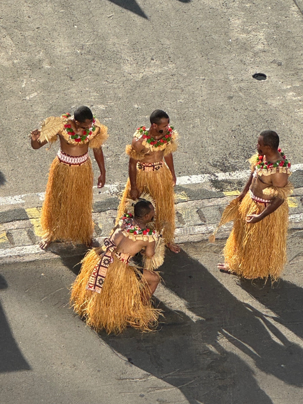Dort angekommen, wird das Schiff bereits erwartet und laut „Bula“ (es soll das übersetzte Wort für Gesundheit bzw. Willkommen sein) zu uns hinauf rufend, werden wir von der Musikkapelle und der Folkloregruppe begrüßt.