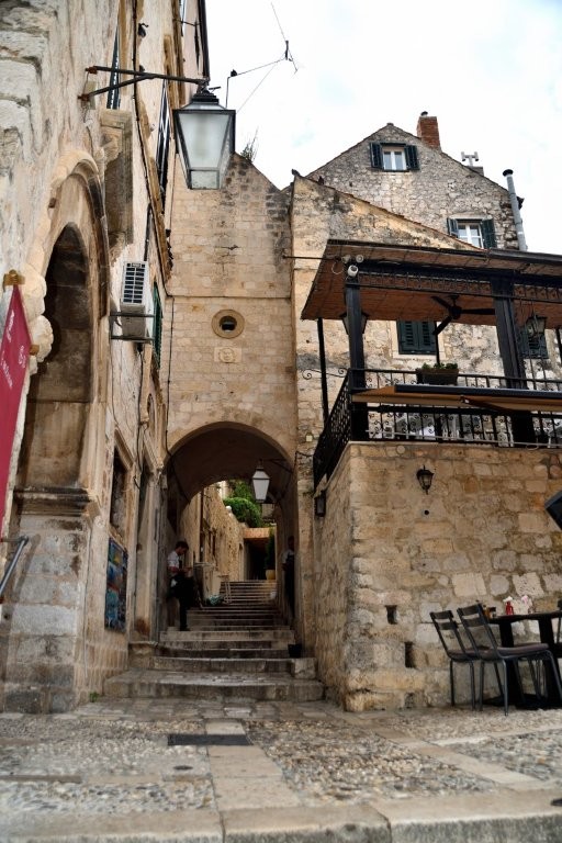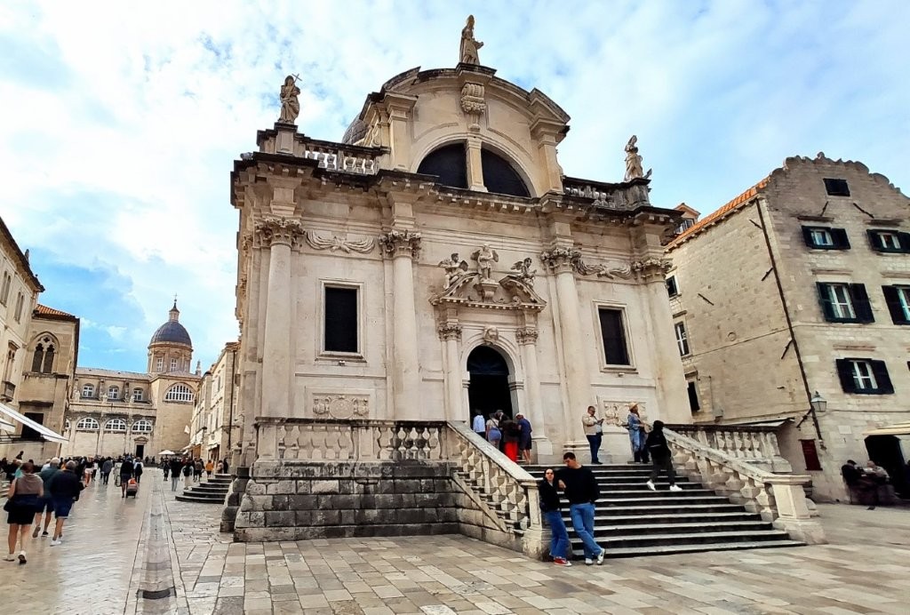 Eng, noch enger durch die Außenbereiche der Restaurants. Dann steil über Treppen nach oben. Zu sehen war die Bergstation der Seilbahn. Noch keine Bewegung ganz oben. Also flanierten wir weiter bis zum Ende der Stradun, die in den Luža-Platz mündete. Der ultimative Platz in der Altstadt mit einer Zusammenballung von historischen Gebäuden. U.a. der Sponza Palast, das Ploče-Tor, der Uhrenturm und die Kirche St. Blasius. Vor diesem für die Einwohner Dubrovniks wichtigen Gotteshaus standen wir.