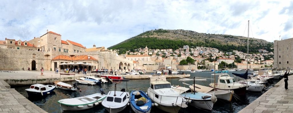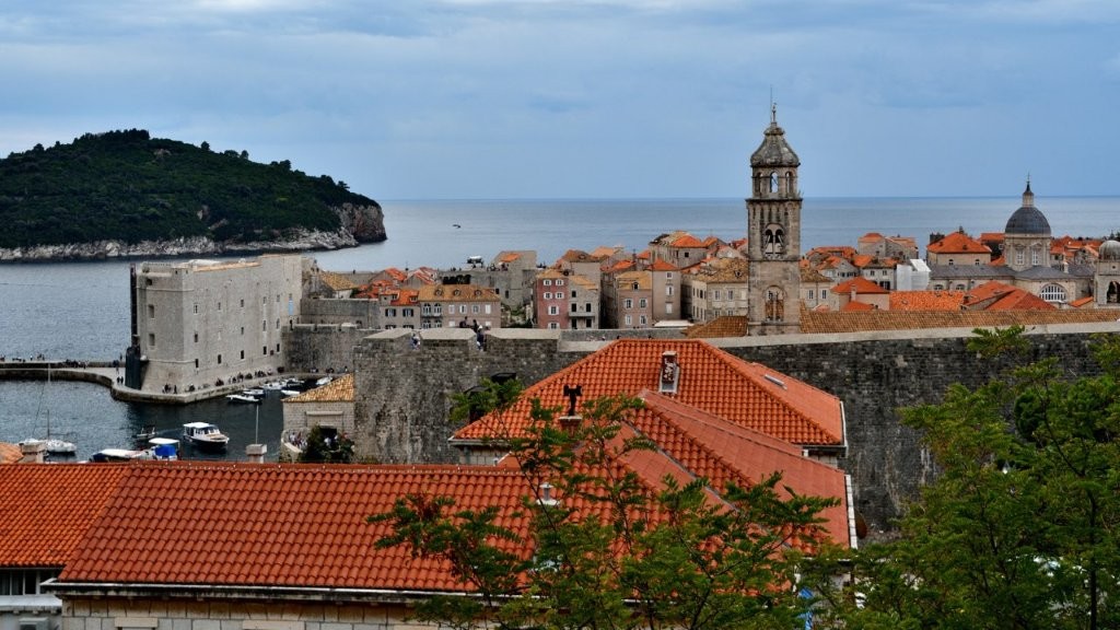 Der alte Hafen, der Turm der Kathedrale. Im Vordergrund der Turm Gronji Ugao, in dem sich ein Museum befindet. Die bewaldete Insel Lokrum, auf der Richard Löwenherz Ende des 12. Jahrhunderts Zuflucht vor einem Sturm fand und später als Dank Mittel zur Finanzierung der Kathedrale locker machte. Und auf der ein Game of Thrones – Museum existiert.