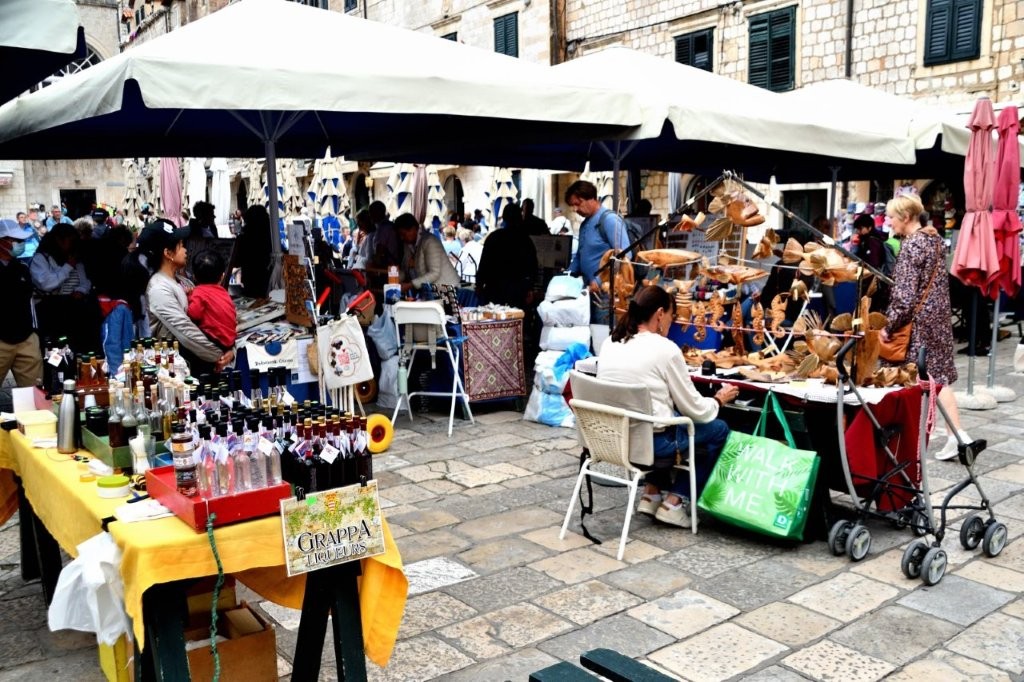 Wir gingen sie langsam hinunter und gelangten zu einem der immer wieder während unseres Stadtspaziergangs auftauchenden Plätzen – nunmehr zum Gunduliceva Platz. Mittendrin steht auf einem Sockel Ivan Gundulić, der bedeutendste kroatische Dichter der Barockzeit. Er wacht darüber, dass alles mit rechten Dingen abläuft. Besonders an Markttagen, wenn heimisches Obst und Gemüse, Olivenöl und Gewürzpflanzen angeboten wird. Wir beobachteten ein herrliches Treiben Einheimischer und Touristen um die Stände herum und stellten fest, dass man Angebote auch auf Touristen abgestellt hat: