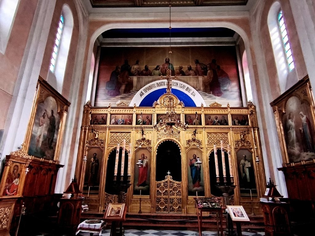 In der weitgehend „unmöblierten“ Kirche sticht im Altarbereich ein Gemälde des letzten Abendmahls hervor. Angeschlossen ist ein Museum mit vielen Ikonen.