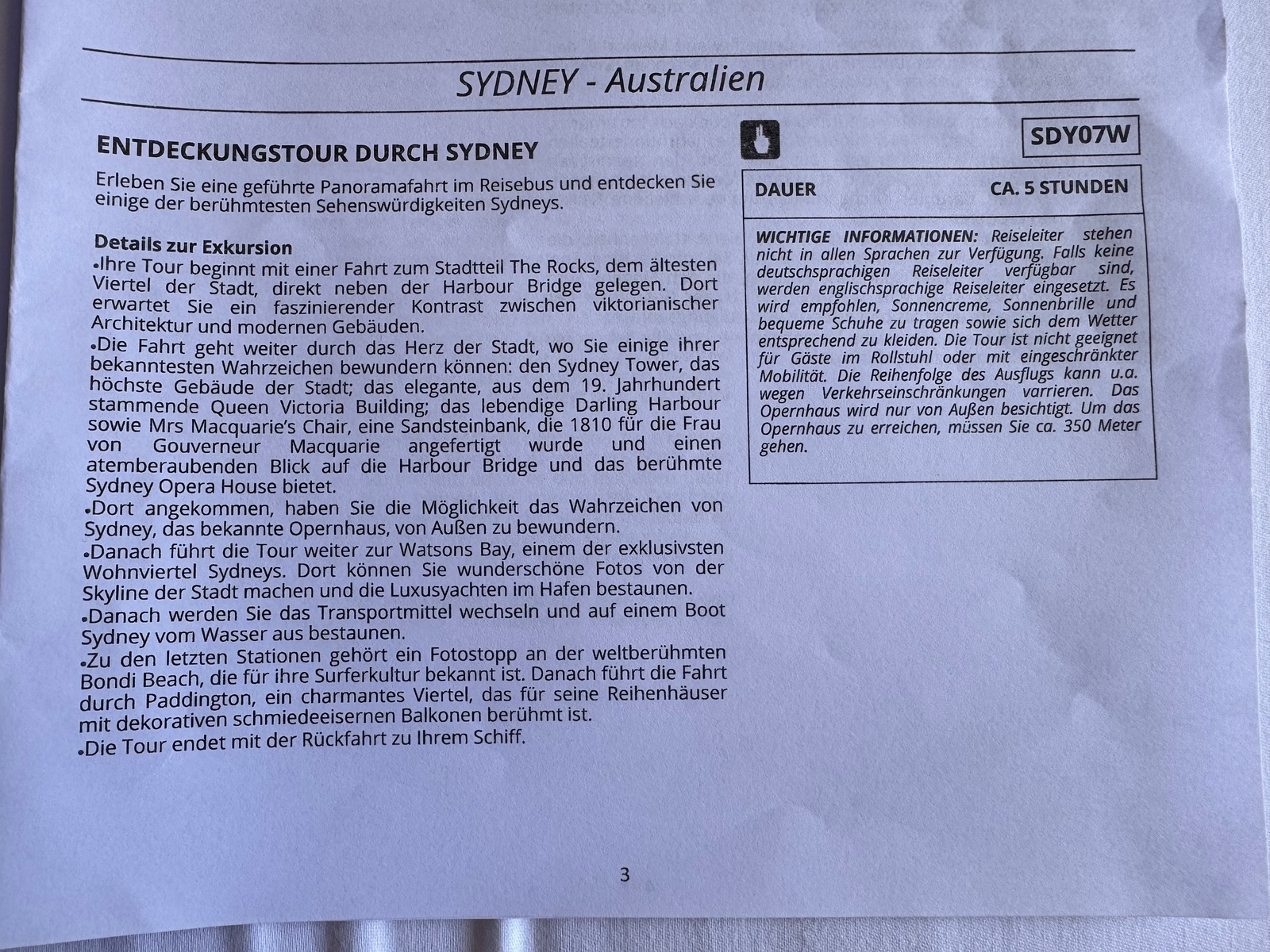 Und so kam mir gerade der Gedanke, den Reiseblog zum heutigen Seetag dahingehend fortführend zu gestalten, euch daran teilhaben zu lassen, wie es sich auf der Weltreise bezgl. Ausflugsbuchung verhält.