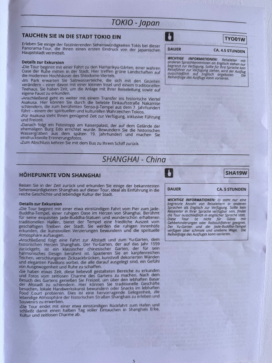 Den Vormittag hatte ich mich mit der Ausflugsbroschüre für den Reiseabschnitt „Nagasaki bis Penang“ beschäftigt.