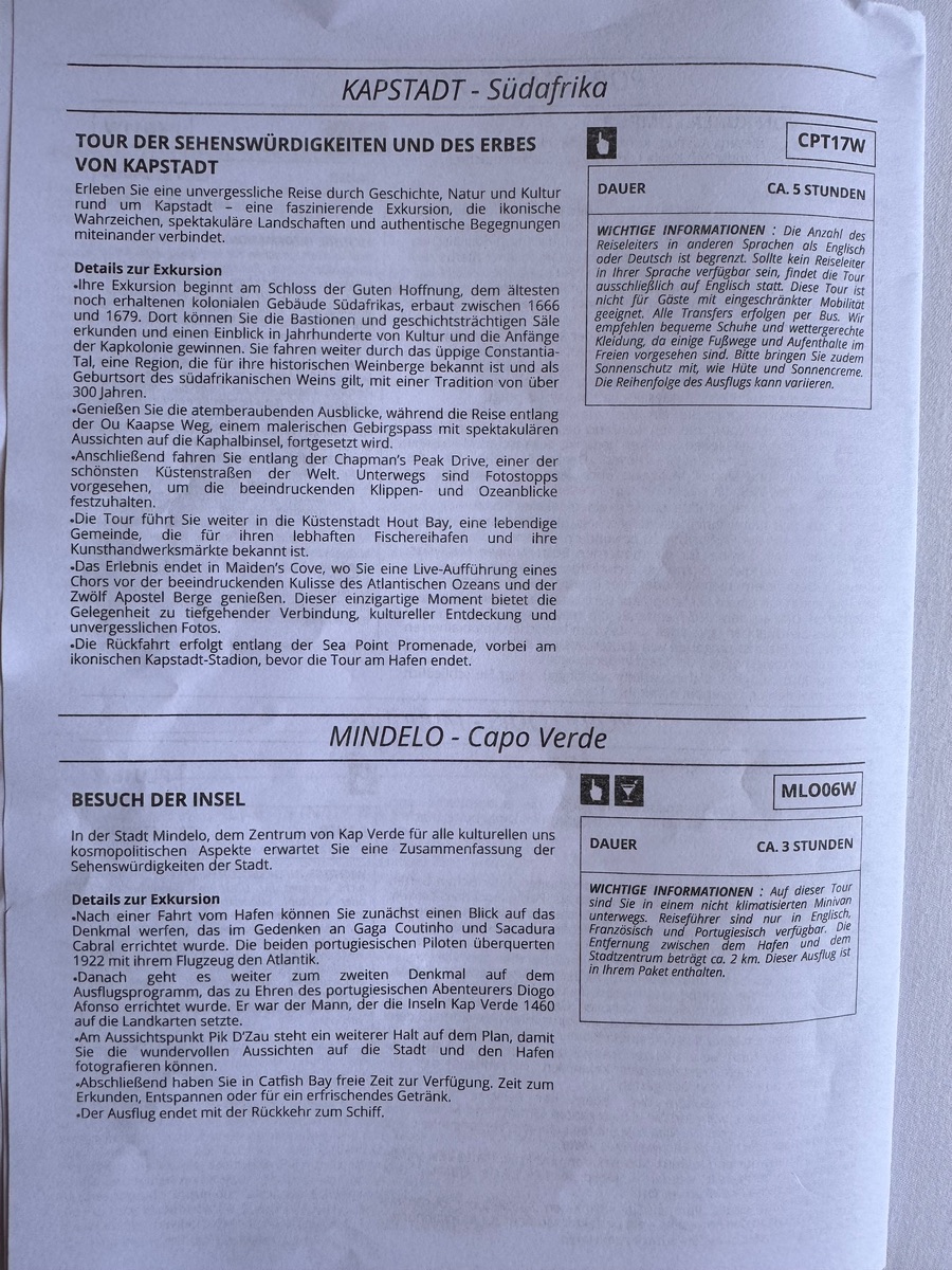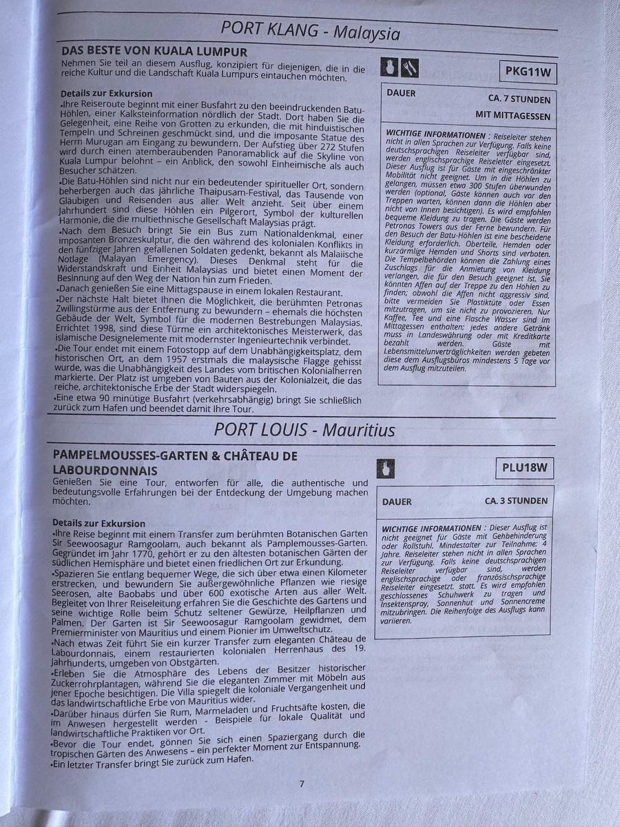 Damit habe ich mich nun heute Vormittag beschäftigt und noch einmal abgeglichen, zu welchen Destinationen wir uns bereits für die durch die Reederei angebotenen inkludierten Ausflüge eingebucht haben und an welchen Destinationen wir noch zusätzliche Ausflüge auch schon gebucht haben.