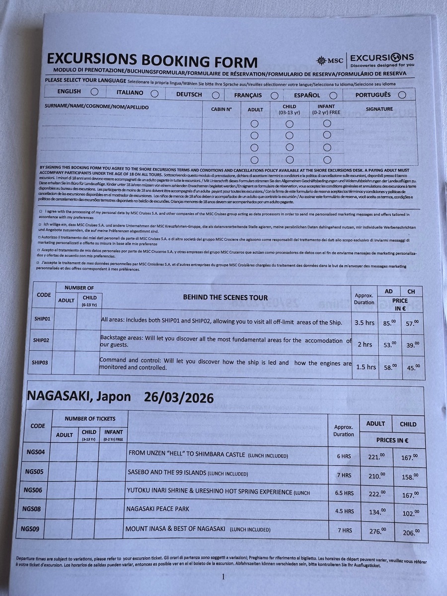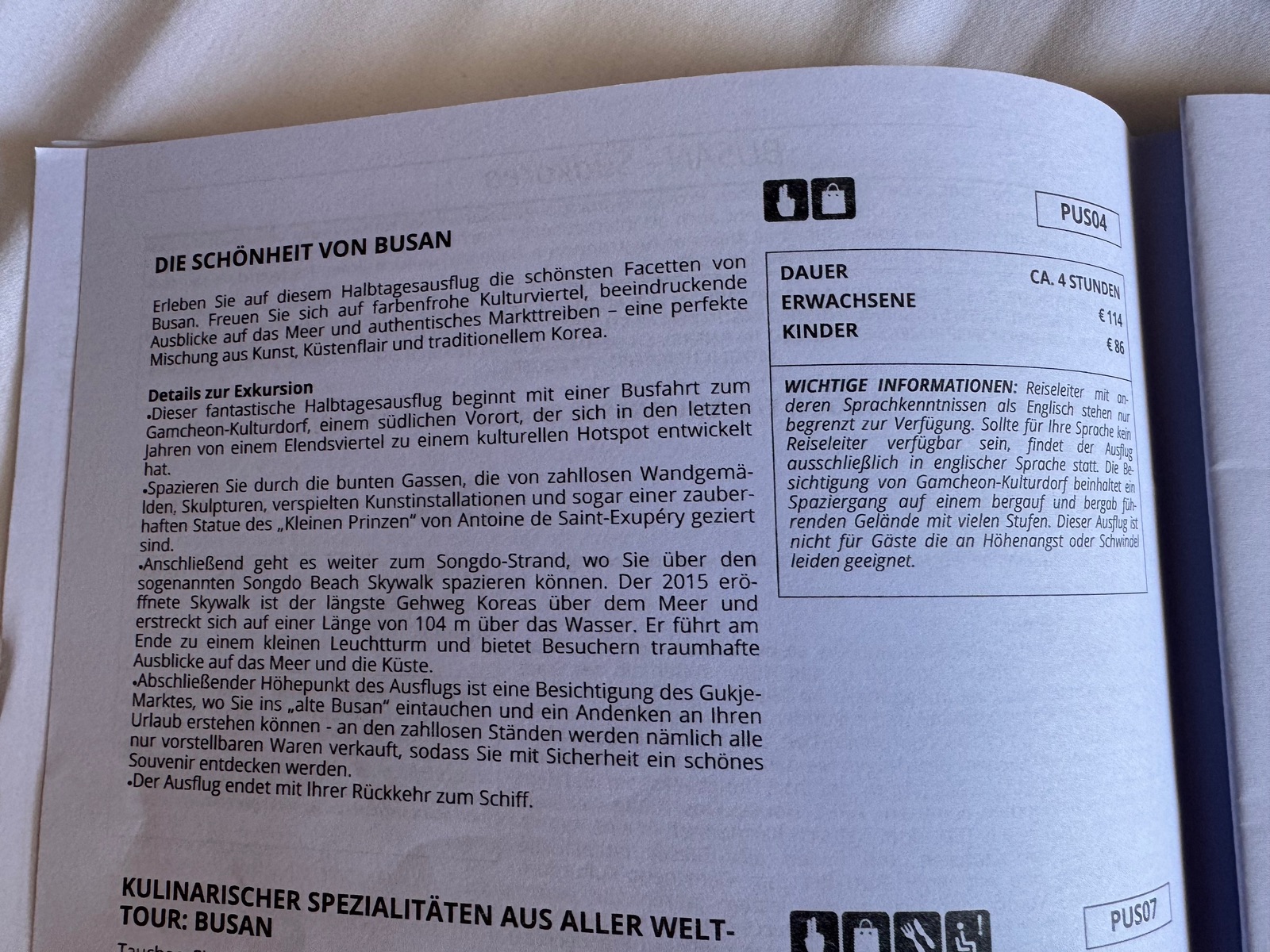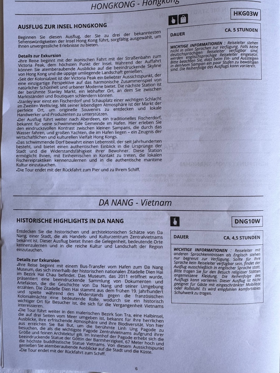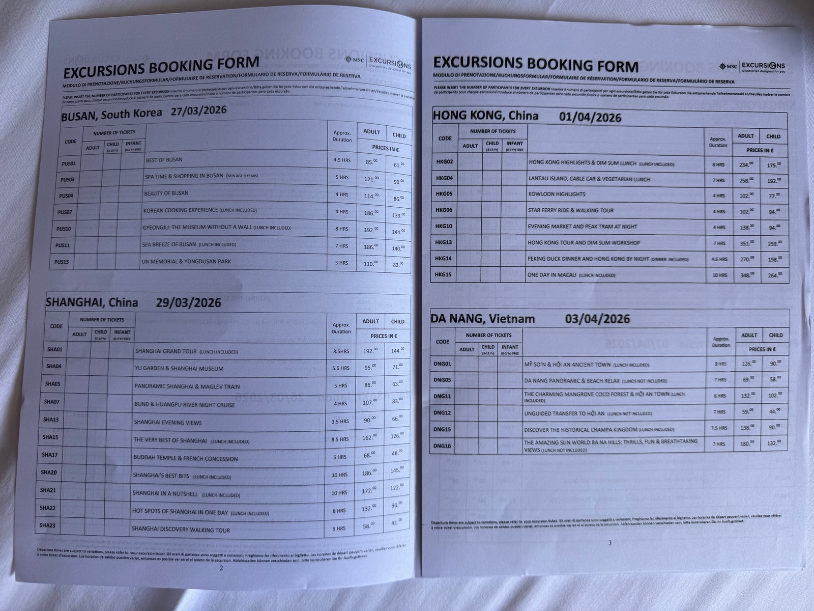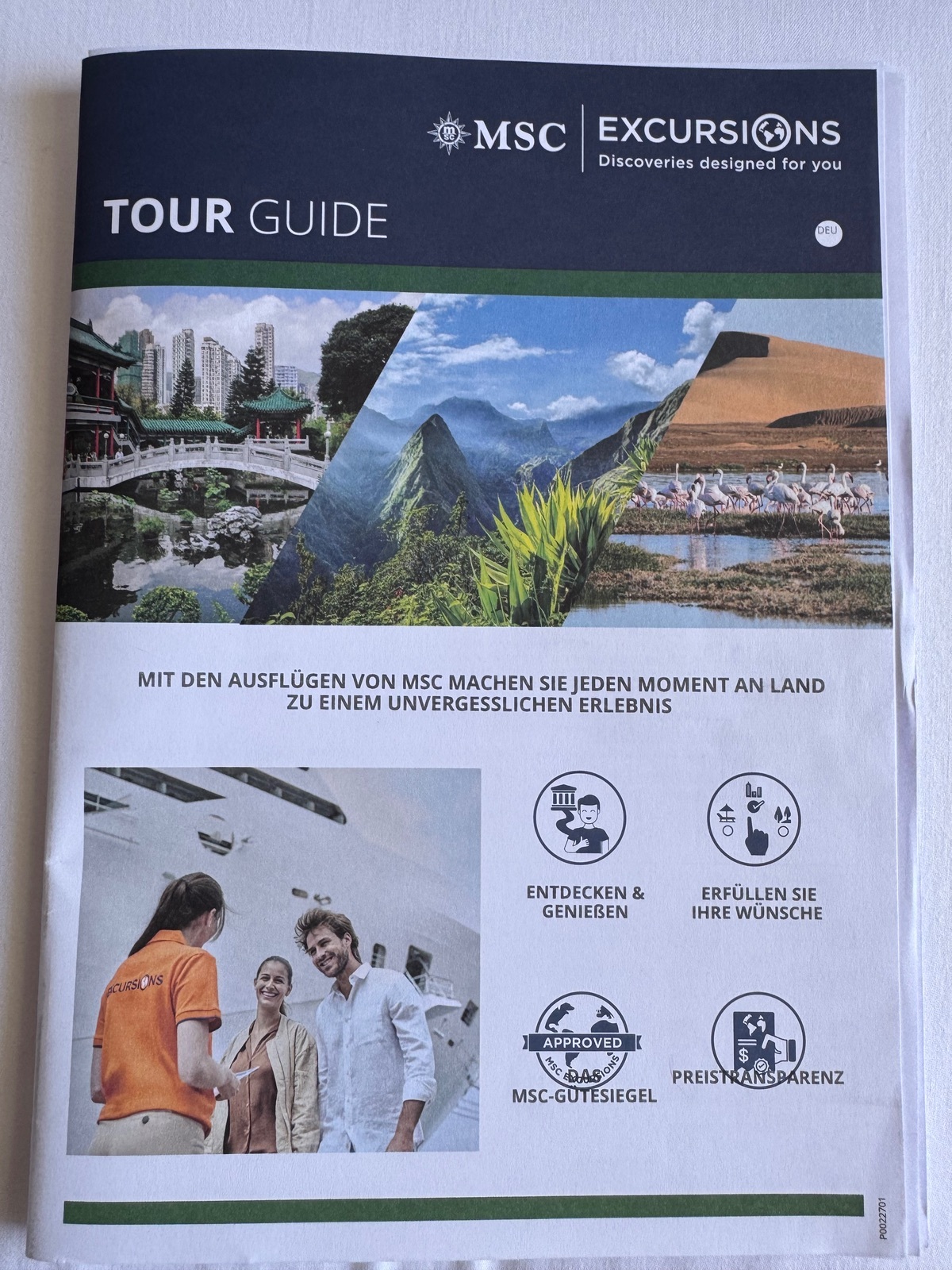 Dazu bekommt man zu Reisebeginn einen Buchungsbogen aller 15 Ausflüge, auf dem man ankreuzt, ob man teilnehmen möchte.