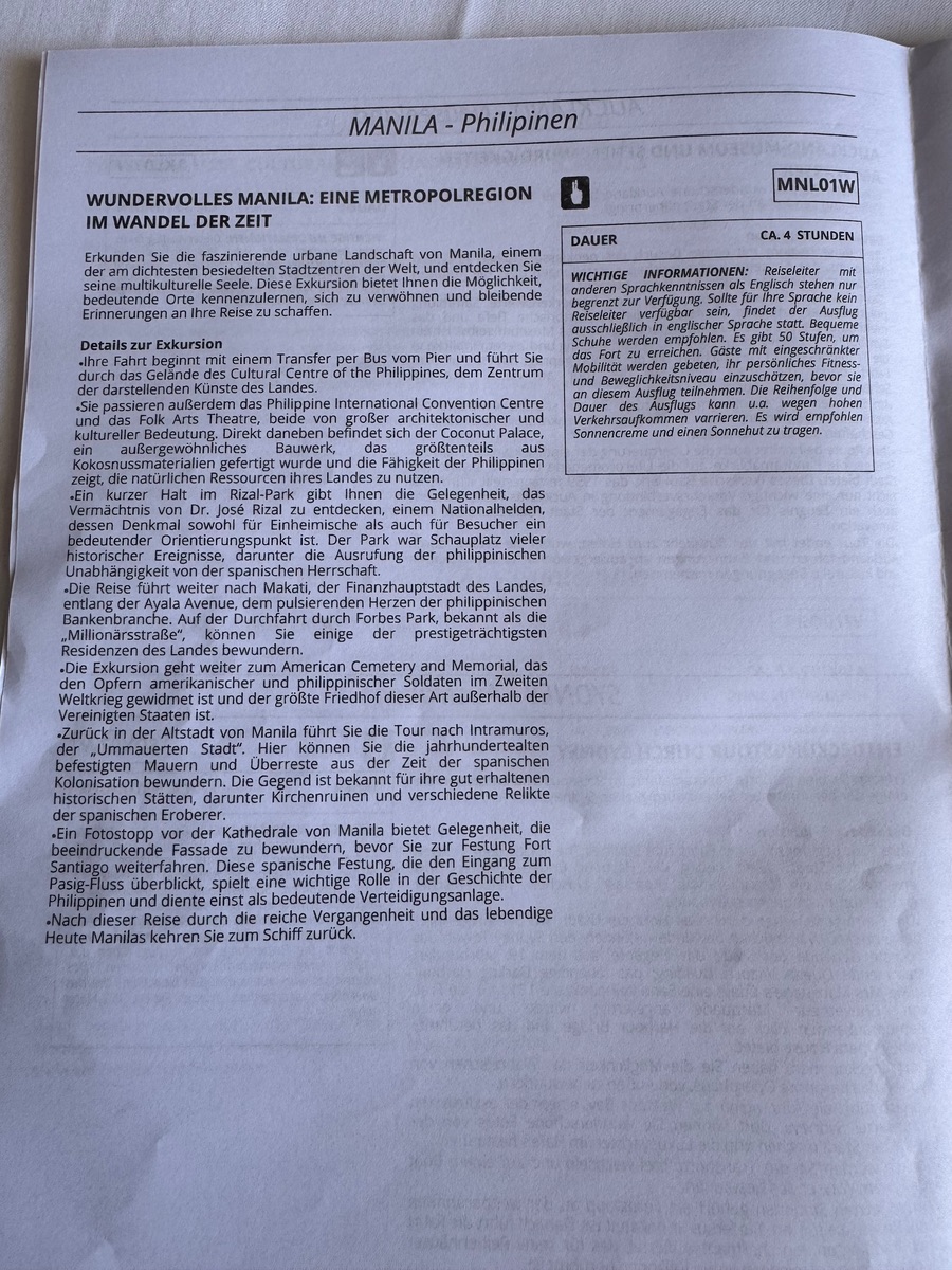 Gestern Abend, nach dem Turn-Down-Service, fanden wir diese umfangreiche Broschüre auf der Kabine vor.