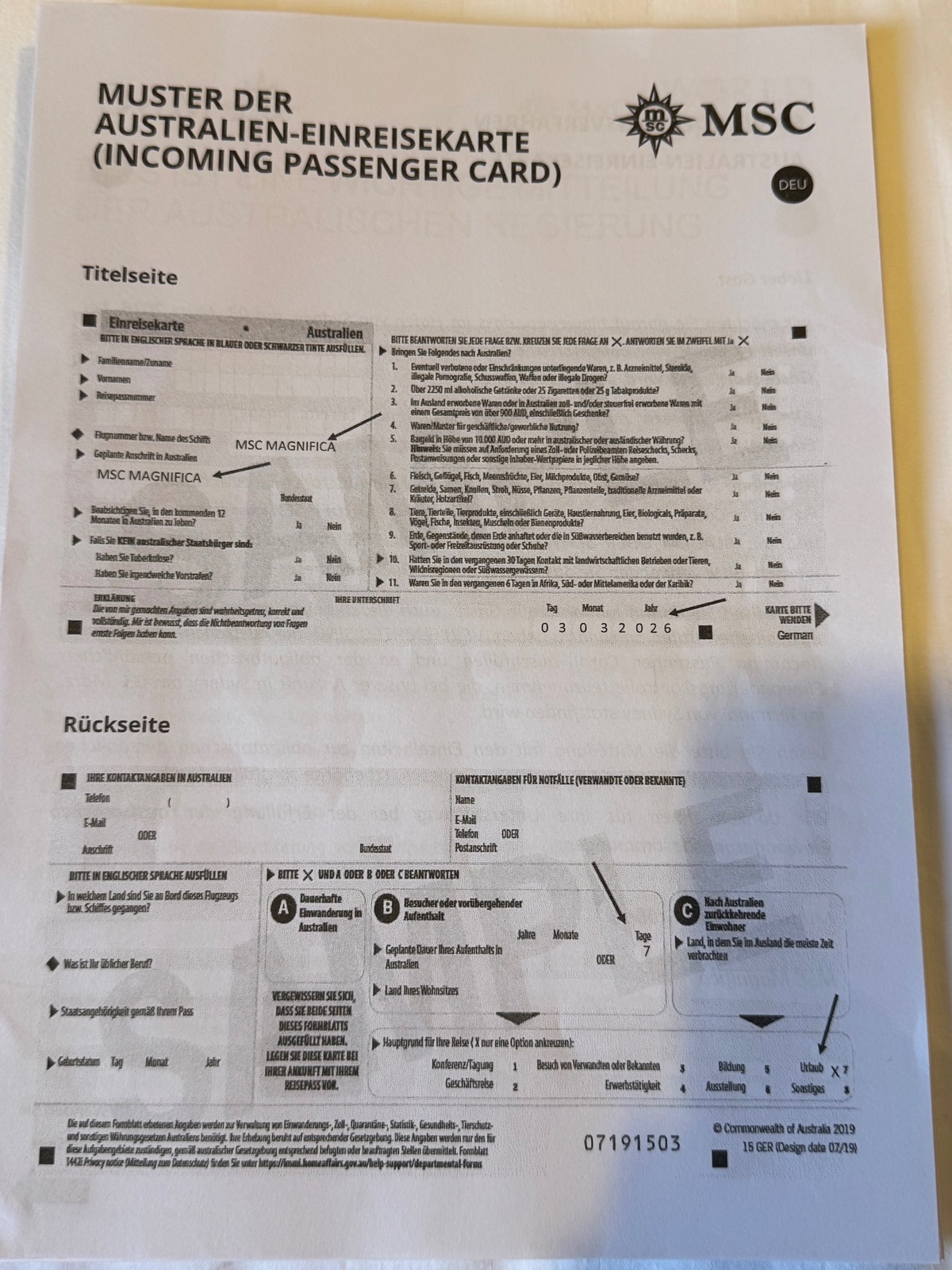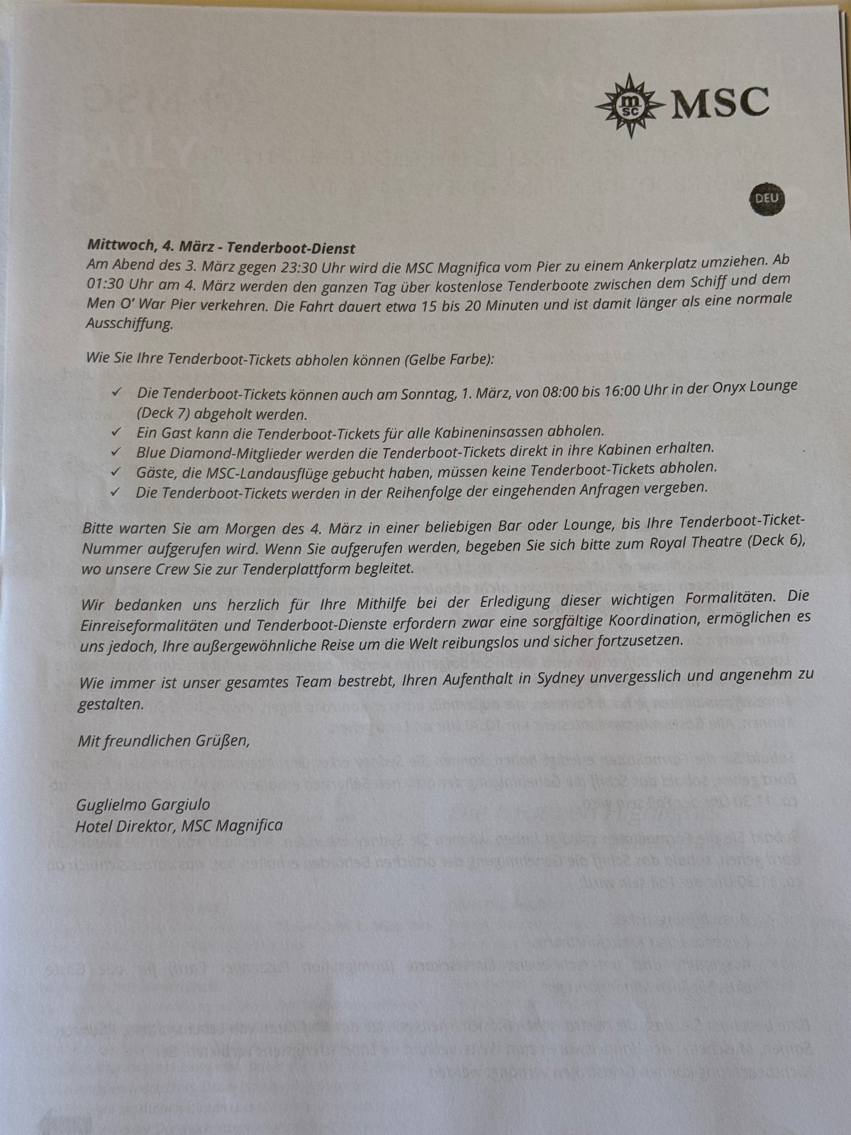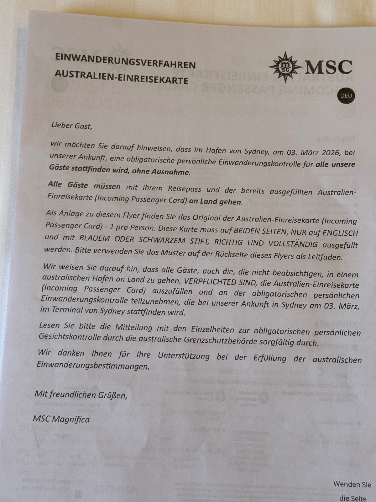 Dazu bekamen wir vorgestern Abend schon, durch unseren Kabinensteward während des Turn Down Services, wieder einen genauen Ablaufsplan in die Kabine gelegt und zusätzlich auch die blanko Einreiseerklärungskarten, nebst Ausfüllhilfe, welche wir ausgefüllt bei Einreise mit unserem Reisepass den Behörden vorzulegen haben.