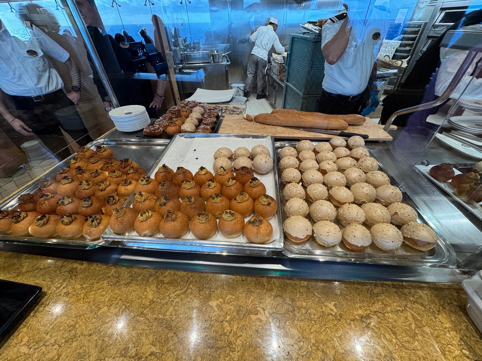 Die Überraschung des heutigen Frühstücksbuffets waren: „süße Gebäckstücke“, minimal gefüllt mit Moccacreme oder mit weißer Schokolade überzogen.
