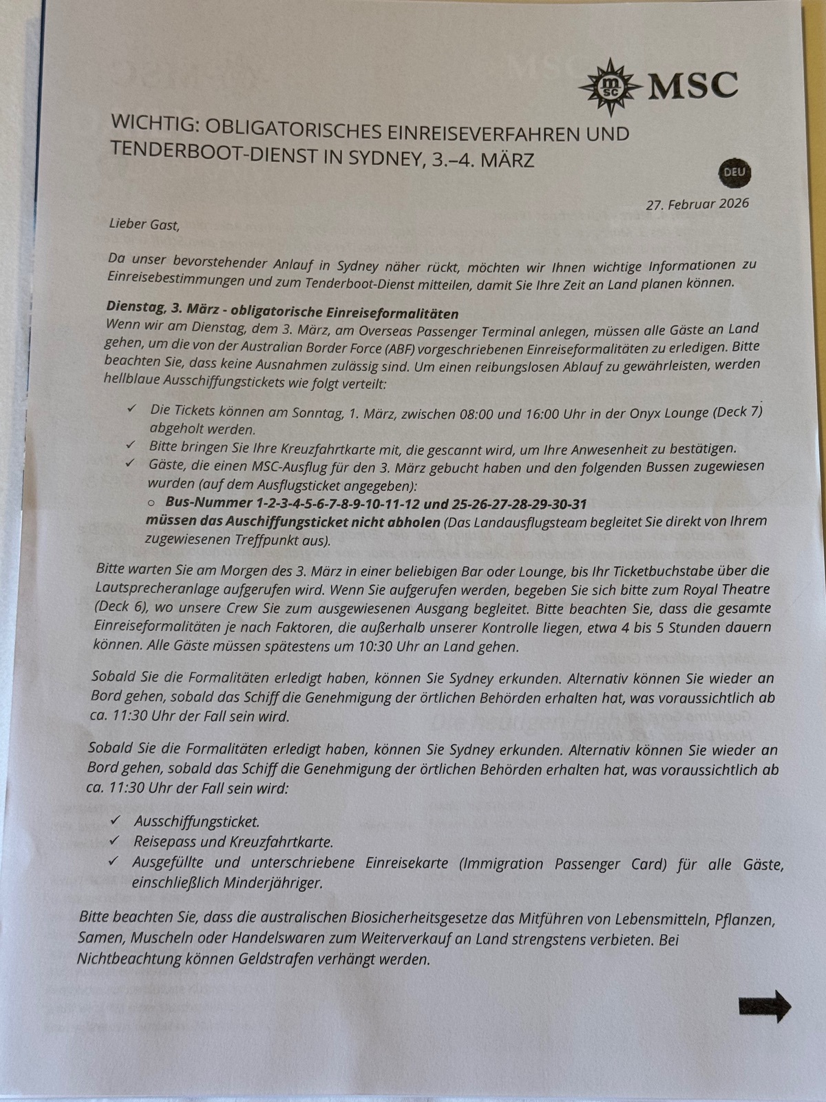 Alle Passagiere müssen dieses Procedere in Sydney am Vormittag durchlaufen und offiziell persönlich die Einreise vollziehen und dabei von Bord gehen.
