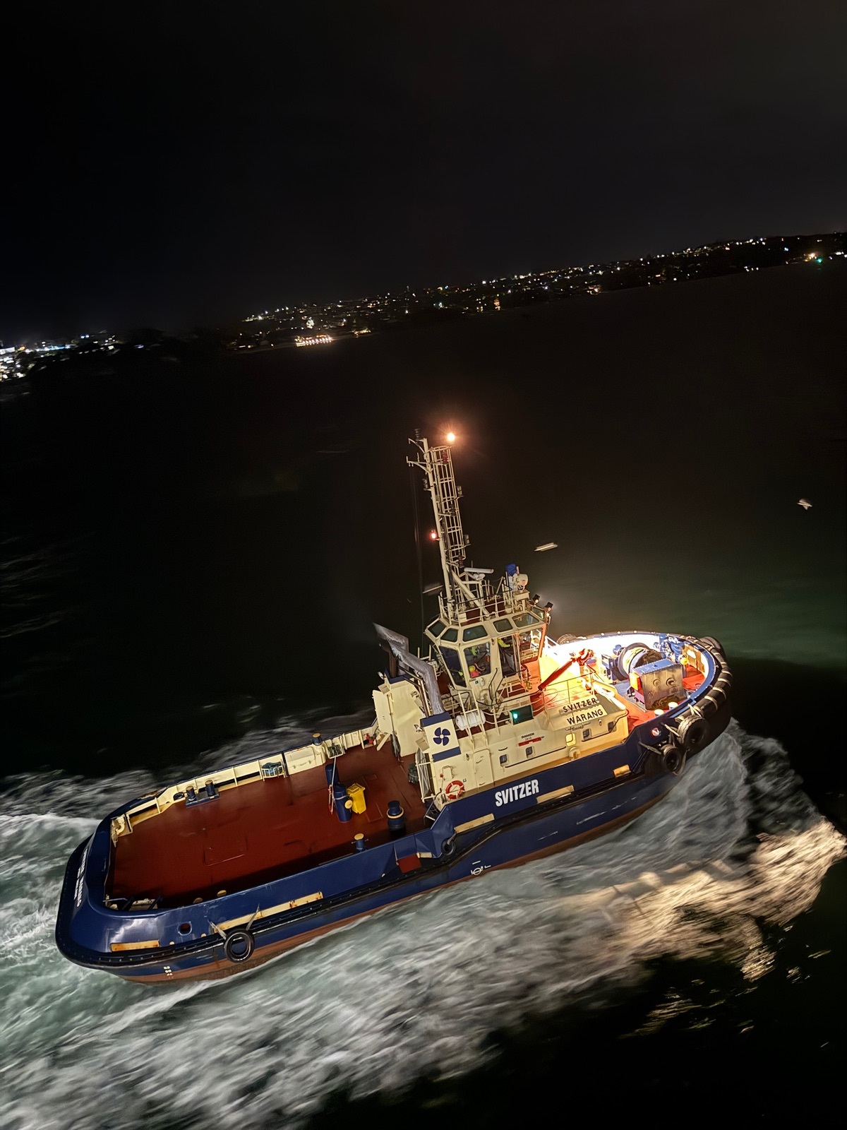 Es ist ein Schlepper, der quasi unter unserem Kabinenbalkon in gleichem Tempo neben dem Schiff herfährt und uns bei der Hafeneinfahrt begleitet.