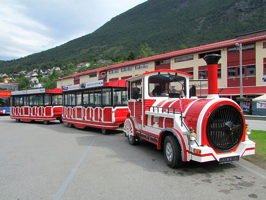 Direkt am Schiffsanleger befindet sich nicht nur die Haltestelle des "Briksdal Glacier Shuttle Bus", der die Touristen regelmäßig zu den Eisriesen bringt. Hier beginnt (und endet) auch die Rundfahrt des "Olden Sightseeing Train". Das Verkehrsmittel hierfür ähnelt sehr dem "Rallartoget" in Flåm.