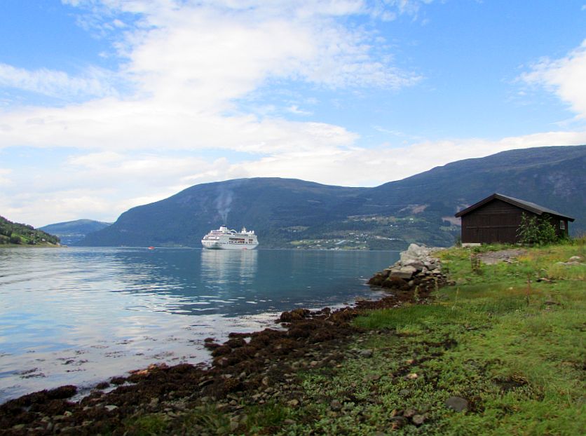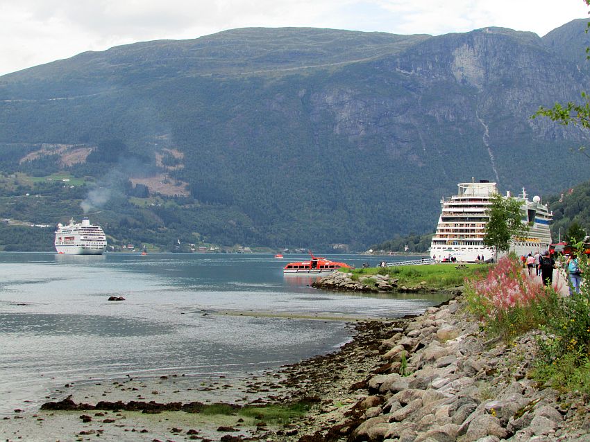 Wunderschöne Ausblicke über den Fjord und die beiden Kreuzfahrtschiffe hat man von hier.