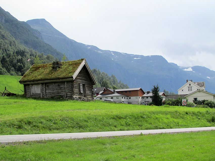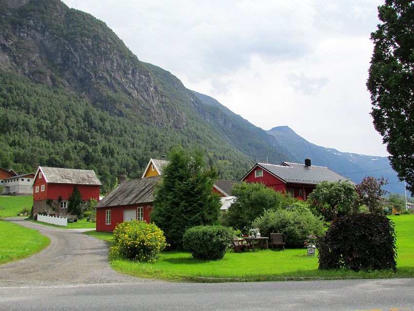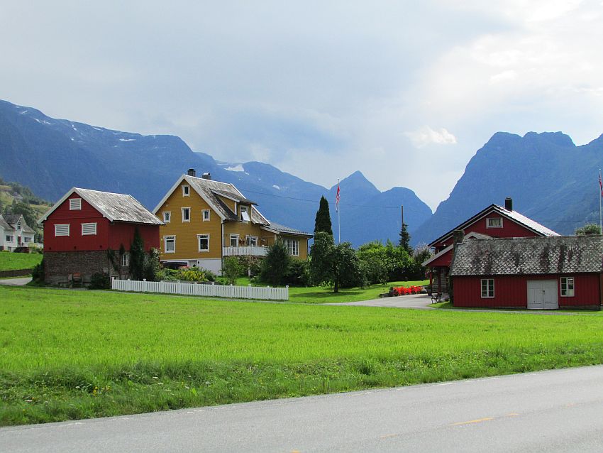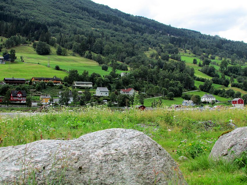 So geht´s für mich zu Fuß weiter - durch die Wärme des norwegischen Sommertages. Vieles gibt es nicht zu sehen, dafür jede Menge Beschaulichkeit zu erleben. Eine überschaubare Anzahl kleiner, hübscher Häuschen - willkürlich in die sattgrüne Landschaft gestreut: