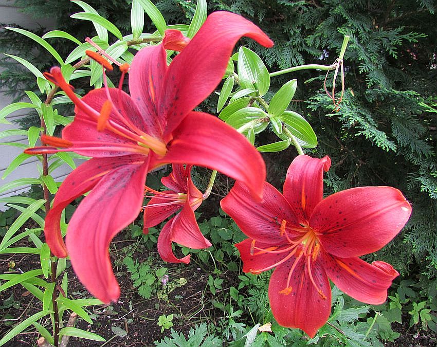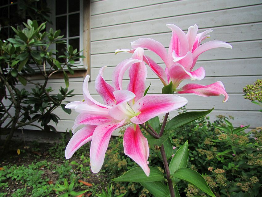 Die Eingänge der Häuser beidseits der wenig befahrenen Hauptstraße sind hübsch dekoriert mit Blumenkübeln. Und in den Vorgärten blühen Lilien, von deren imposanter Größe ich zu Hause nur zu träumen wage.