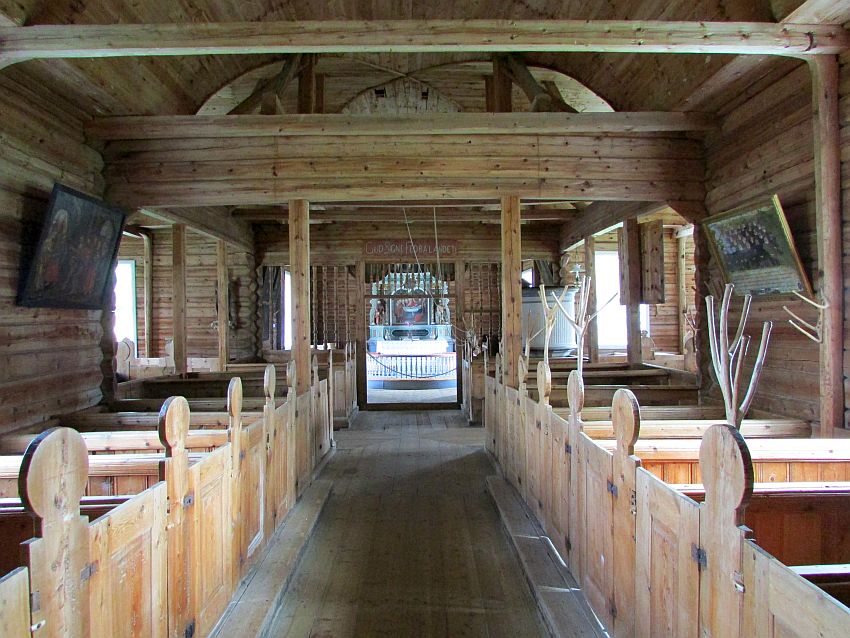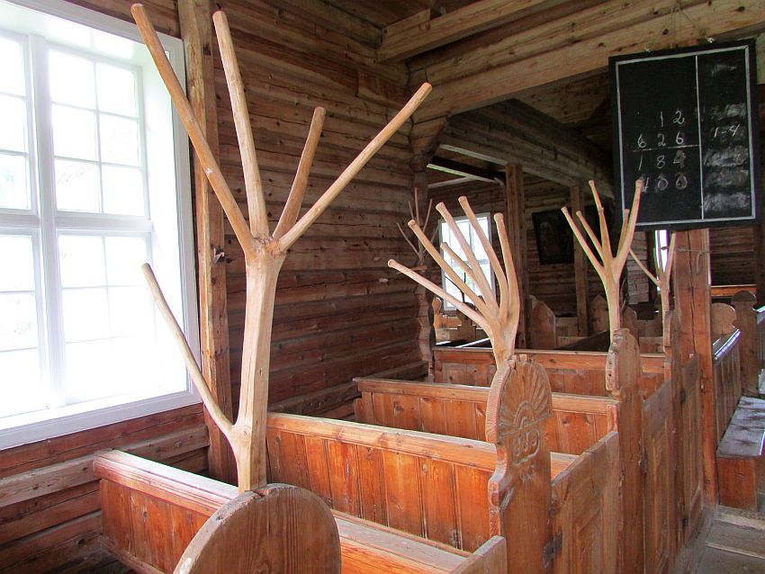 … sowie den Kirchenbänken, die an manchen Stellen mit geschnitzten Ästen heimischer Hölzer verziert sind.