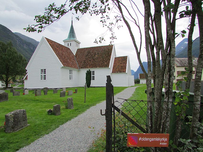 Erbaut im Jahre 1759 ist sie die einzige Kreuzkirche der Region Nordfjord, in welcher das der Gemeinde Stryn zugehörige Olden liegt. Frühere Grabungen unter dem Boden der Kirche brachten etwas zu Tage: Vor noch längerer Zeit befand sich genau an dieser Stelle eine Stabkirche.
