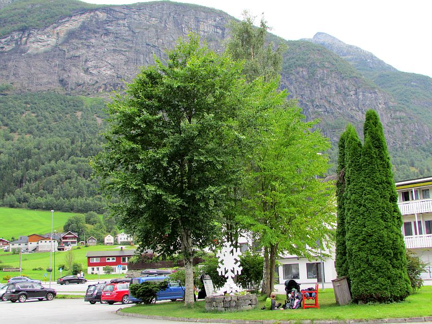 Fast tut es mir schon ein bisschen leid, dass sich gerade so gar keine Fahrgäste finden - weder für den Doppelstockbus zum Gletscher noch für den kleinen rot-weißen Zug. Doch ein Blick auf meine Uhr sagt mir, dass ich die Zugfahrt durch Olden, welche ich wirklich gern gemacht hätte, aufgrund der angegebenen Abfahrtszeit und des mir dann nur sehr knappen, zur Verfügung stehenden Zeitfensters nicht richtig hätte genießen können. Doch ich hoffe, eines Tages hierher zurückzukehren, und dann lasse ich mich mit dem "Bähnle" durch das "Tor zu den Gletschern" chauffieren.