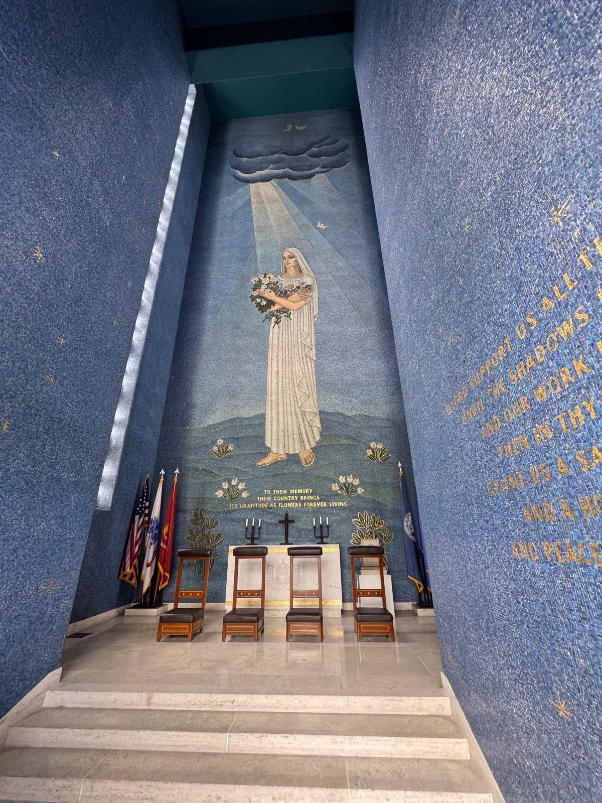 Den 36.000 Opfern, die vermisst blieben, gedenkt man namentlich an den Wandelgangmauern, welche links und rechts, zu der kleinen mittigen Kapelle, mit ihren wundervollen Mosaik verzierten Wänden, den zentralen Punkt der symmetrischen Anlage bildet.