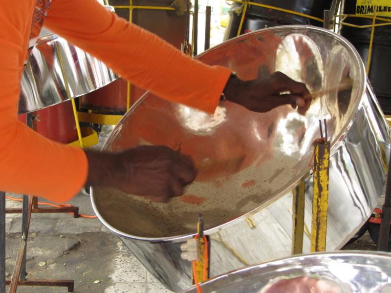 Wir besuchen noch einen Klub und dort stehen sie rum, glänzend poliert für den nahenden Karneval, die Trommeln. Die Steel Pans (polierte Ölfasstrommeln, die glaube ich mich zu erinnern, dass sie 28 - 32 verschiedene Tonstufen haben) werden beim Umzug auf Wagen verladen und von Menschen geschoben!! Es gibt Leute, die reißen sich drum, mit zuschieben. In den Dreißigerjahren (also 1930) wurde dieses Instrument auf der Insel erfunden und ist heute das Nationalinstrument. Vorher haben die Einwohner auf afrikanischen Schlagintrumenten Musik gemacht. Aber als die britische Kolonialherrschaft kam, wurden sie kurzerhand verboten. Not macht erfinderisch. Ölfässer gab es genug in Verbindung mit der Erdölprdoduktion und so bauten findige Tüftler die ersten Steel Pans, wie die Teile auch noch heute hießen. Gunda spielt uns was vor, sie kann es - sie ist in einem Club. Die Jungs der Band sind etwas träge, wohl zu heiß oder zu viel aus den grünen Flaschen konsumiert.