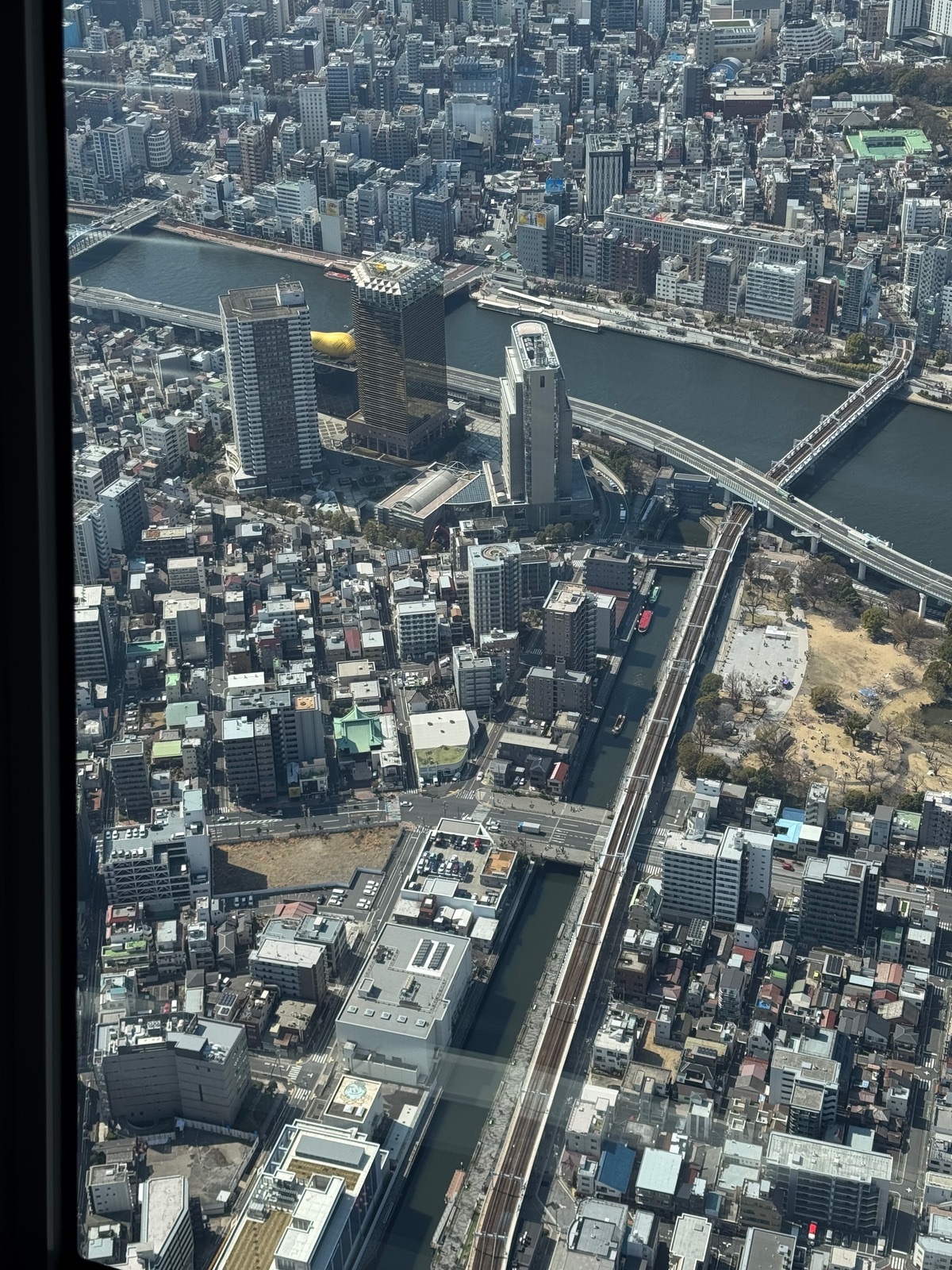 Der Rundumblick ist schon gigantisch und man sieht dabei sehr gut, von wieviel Wasser Tokyo umgeben und wieviele Wasserarme und Flüsschen es innerorts gibt, sodass unzählige Brücken für die Anbindung zu den Vierteln dazu notwendig sind.