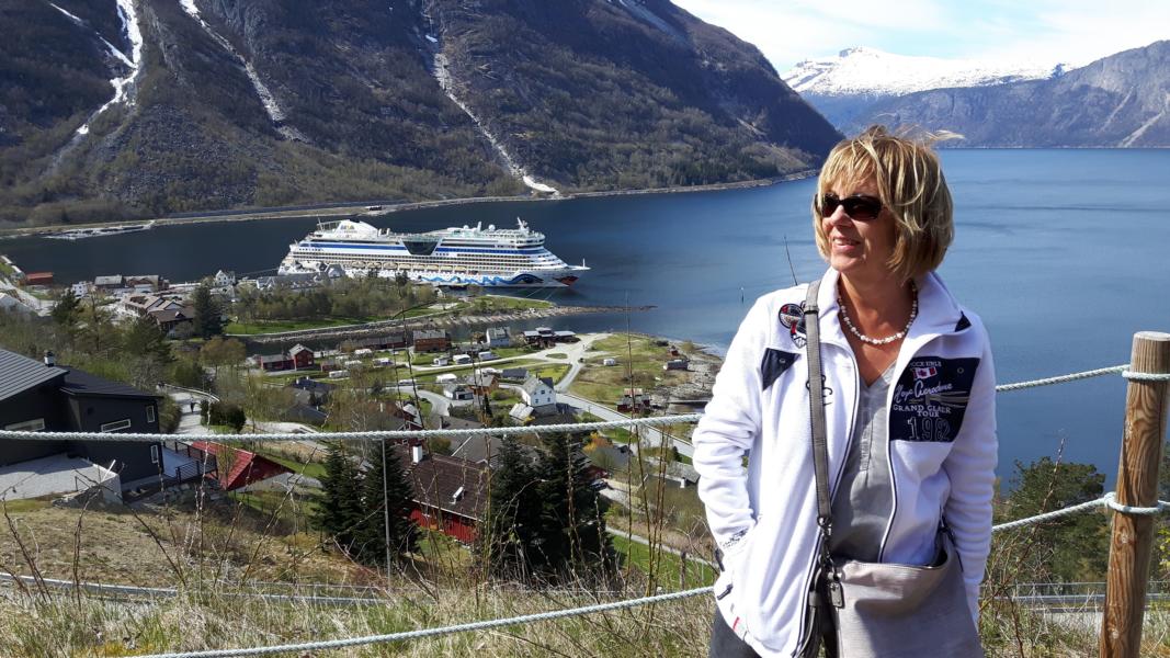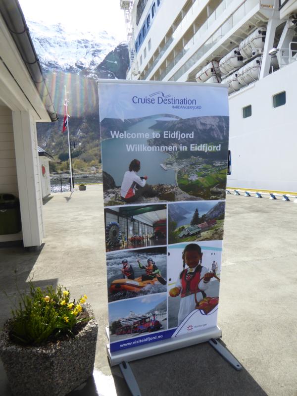 Die Luna kommt um 11 Uhr in Eidfjord an. Die Fahrt von Ulvik war sehr schön und nun freuen wir uns, dass wir Landgang haben. Wir verlassen das Schiff erst etwas später, nachdem wir mit Mutti eine Kleinigkeit gegessen haben und sie es sich wieder häuslich auf dem Balkon eingerichtet hat. „Kinder, alles ist gut – ihr könnt schon mal losziehen und viel Spaß!“ „Vergiss dich aber nicht, noch einzusprühen. Sonst bist du ein roter Krebs nachher“ rufen wir ihr auf dem Balkon zu. „Jaja, das mach ich noch!“