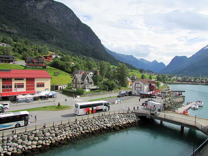 Vom Heck aus bietet sich wieder der Panoramablick auf das malerisch gelegene Olden vor der dramatischen Kulisse der Berge, in denen die Eisriesen "wohnen". Überragt wird der kleine Ort in erster Linie vom Avleinsfjellet mit einer Höhe von 1.500 Metern und vom Skarsteinfjellet mit 1.566 Metern.