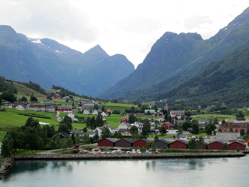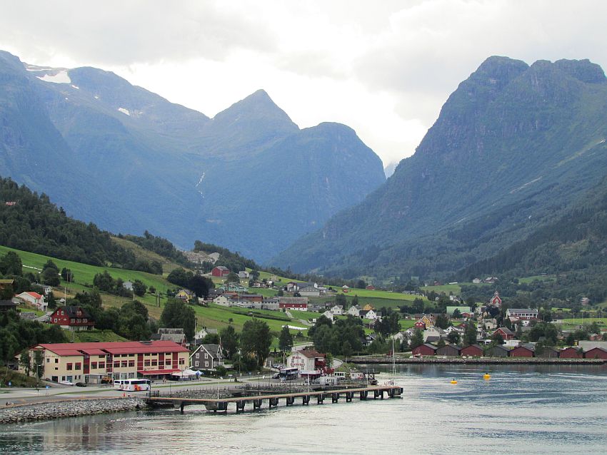 Wir haben uns bereits ein ganzes Stück vom Anleger entfernt, als die Mitarbeiter ihre Flaggen einrollen und der letzte Klang des gefühlsmäßig völlig mitreißenden Liedes verklungen ist. Das spielzeugkleine Olden mit seinen aus unserer Perspektive winzig wirkenden Häuschen bleibt langsam zurück, als nun aus unseren Lautsprechern "Sail Away" ertönt. Ihr Norweger seid so spitze! Danke euch für diesen unvergesslichen Abschied von eurem schönen Fleckchen Erde!