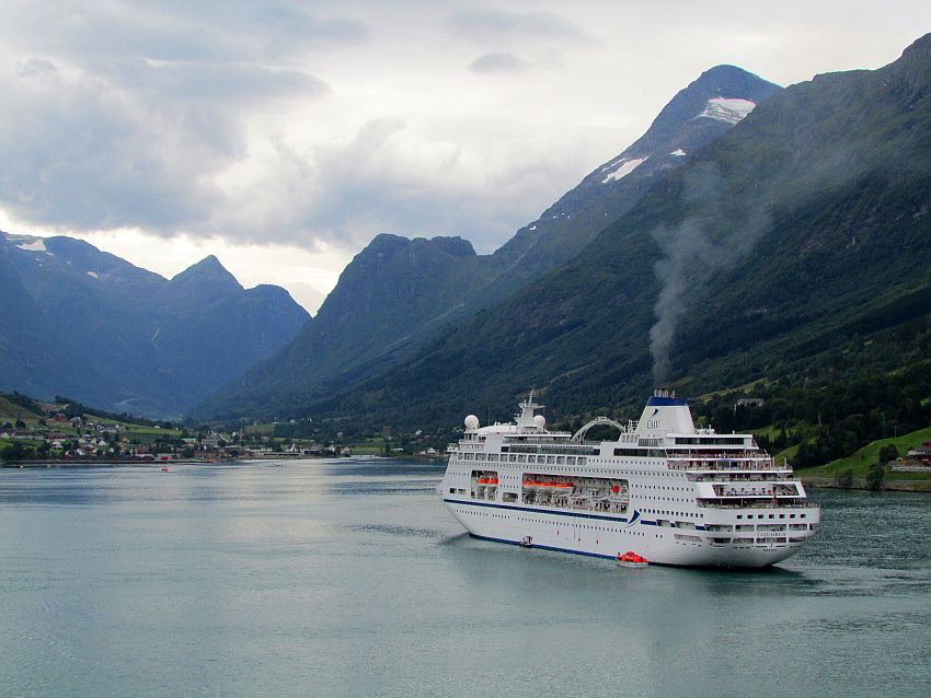 … Majestätisch gleitet AIDAluna in einer sanften Kurve aus dem Innvikfjord. Olden verschwindet langsam hinter der Biegung.