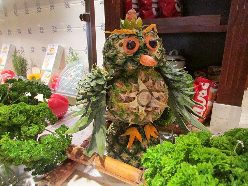 Meine Lieblingsfrüchte, die Maracujas, habe ich bereits entdeckt, sie werde ich zum Dessert genießen. Noch sitze ich allein an einem der großen runden Tische. Als ersten Gang genieße ich heute Käse, nachdem ich den "Wächter der Käsetheke" erfolgreich passiert habe … ![]()