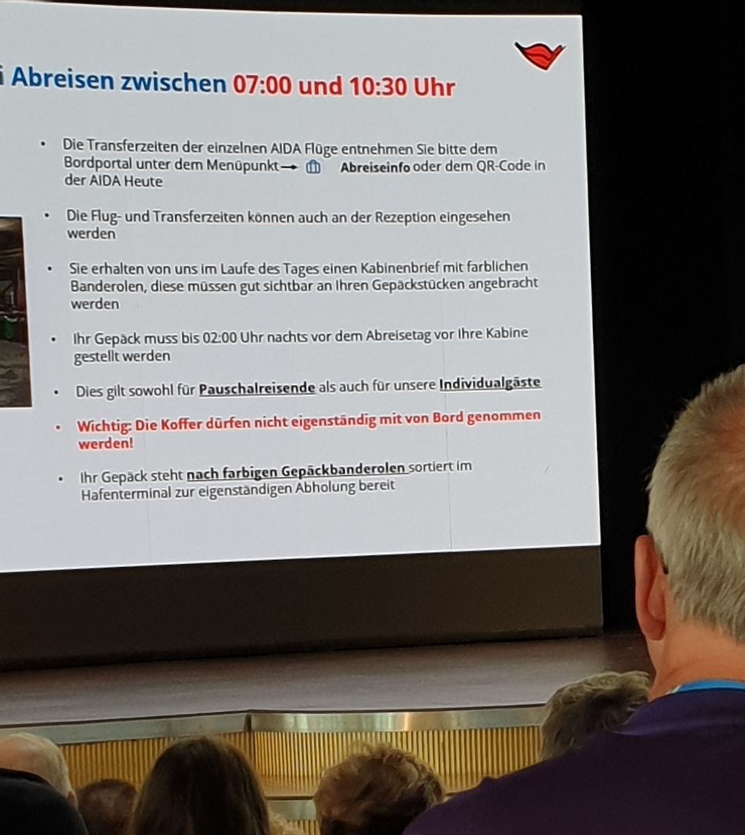 Nach dem Frühstück suchen wir uns gleich einen Platz im Theatrium, denn es gibt ausführliche Abreiseinformationen für die Passagiere, die in Antalya übermorgen absteigen. Traurig denke ich daran, wir gehören auch dazu.