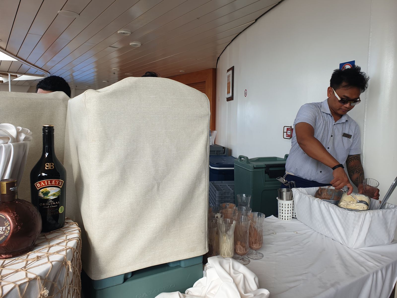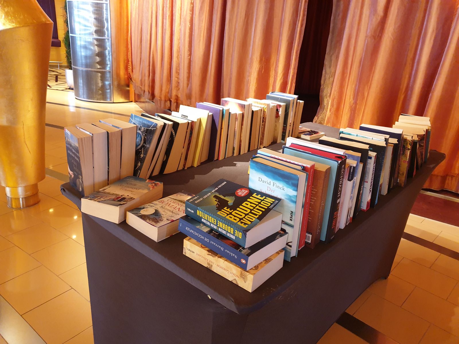 Etwas vorzeitig verlassen wir die Veranstaltung und gehen in die beliebte Bar auf Deck 10.. Dort findet etwas statt, was wir noch nicht kennen. AIDA veranstaltet einen Bücherflohmarkt zugunsten von AIDA Cruise & Help.