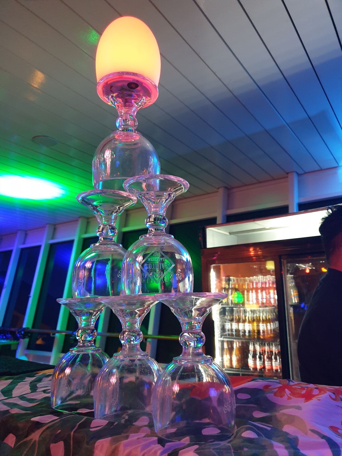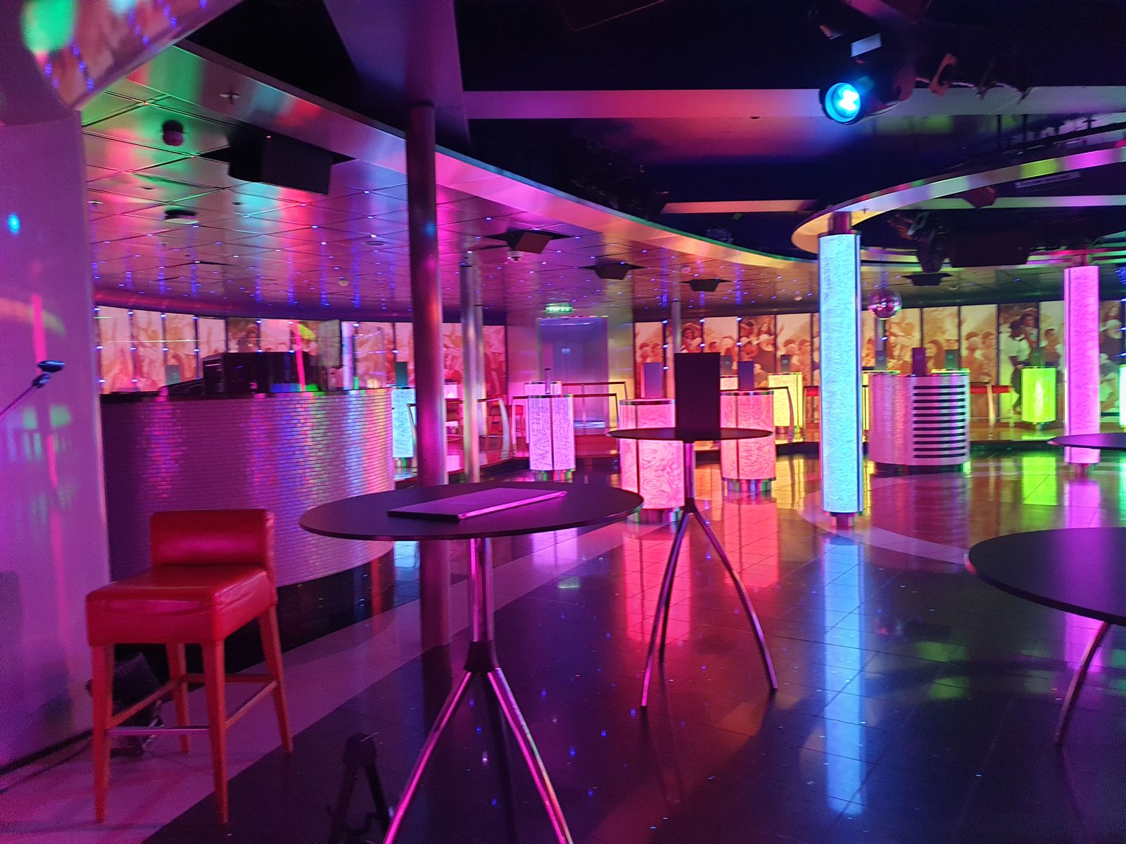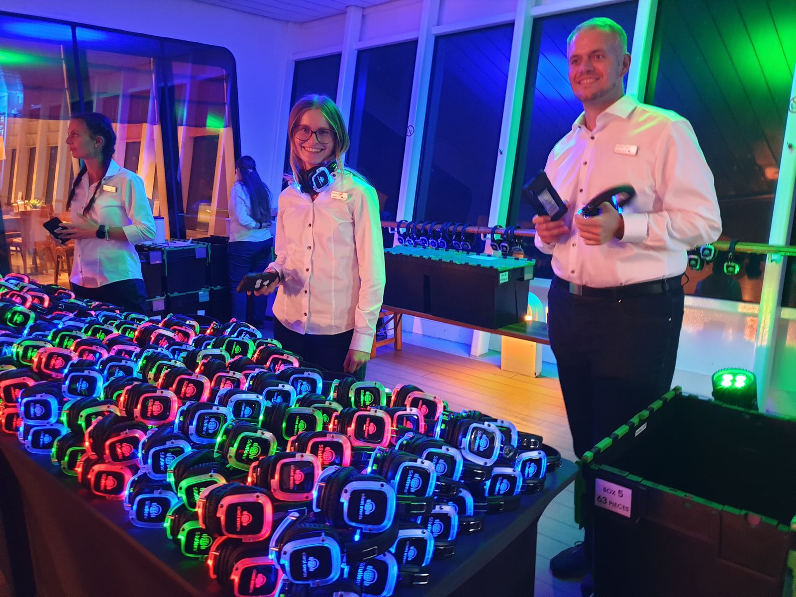 „… und jetzt?“ werde ich gefragt. Antwort „Pooldeck“ und schon sehen wir die bunten Kopfhörer, die das Utensil für die Silent-Party sind.