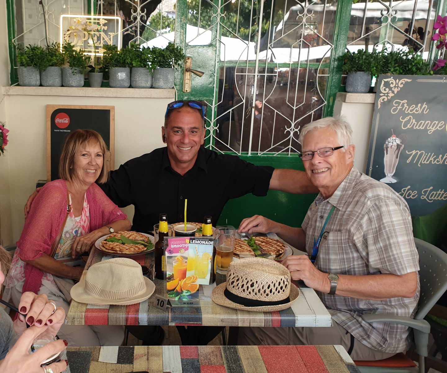 Oh, im Treppenhaus baut sich ein Stau auf, alle wollen an Land gehen – aber zum Glück läuft der Check-Out flüssig und dann stehen wir um 8.15 Uhr an den Ausflugsbussen unseres Freundes Vasilis. Der ist schwer beschäftigt und so kommt eine junge Frau auf mich zu und sagt: „Sie sind ja die Schwester, kommen Sie, Ihr Platz im Bus ist reserviert. Ich werde etwas verlegen, aber so ist unser Freund – uns verbindet viel.
