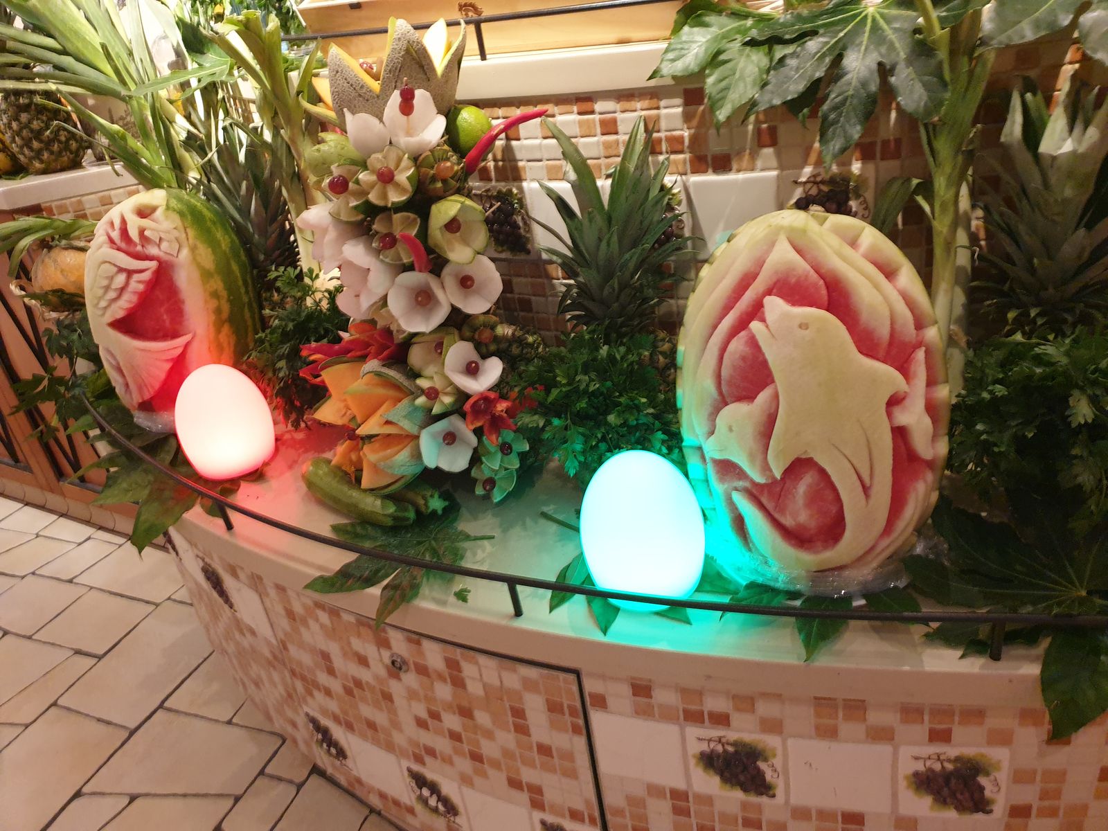 Wir beschließen, noch etwas das herrliche Wetter auf dem Pooldeck zu genießen und dann ist auch schon Zeit für das Farewelldinner im Bella Donna. Die Torten werden auch immer bunter, geht es mir durch den Kopf. Na ja, Zeiten ändern sich. Aber die Deko im Restaurant ist voll nach meinem Geschmack.