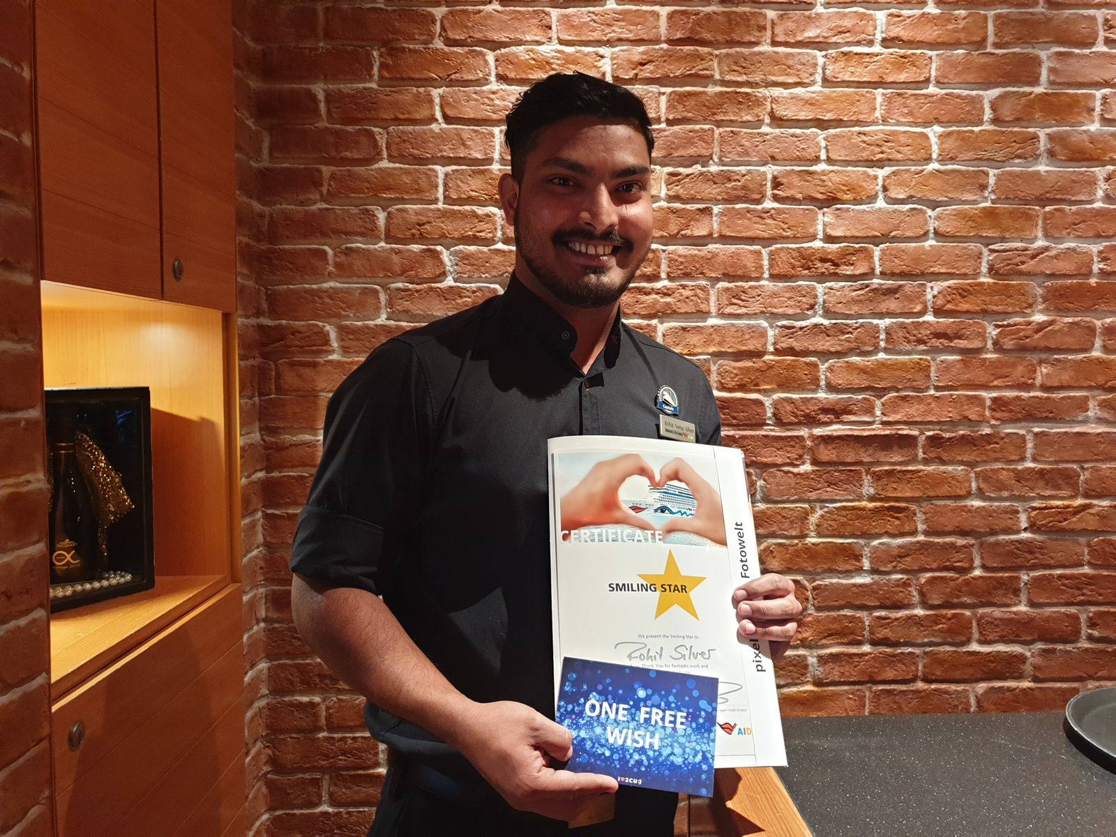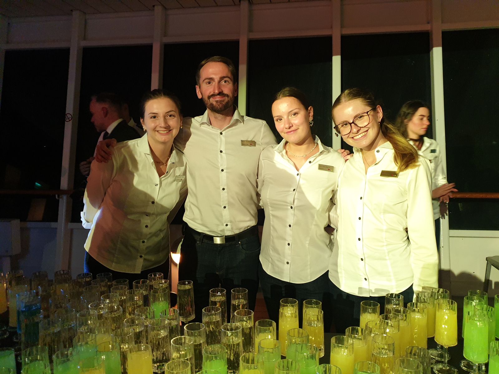 Dann steht unser Kapitän Daniel Richter auf der Bühne mit HD Christoph und EM Sascha. Wir erfahren, dass 140 Passagiere an Bord ihren Geburtstag hatten. Altersspanne von 1 Jahr bis 87 Jahre. Und es gab sogar ein Paar, das seine Eiserne Hochzeit (65 Jahre verheiratet) hier gefeiert hat! Stolz schaut der Kapitän auch auf das Ergebnis zurück, dass auf Mykonos 1.299 Passagiere per Tenderboote an Land gebracht wurden. Ja, und dann marschieren die wahren Helden auf, so kündigt der Kapitän die Crewmitglieder an. Sie leisten eine tolle Arbeit und er bedankt sich bei ihnen dafür.