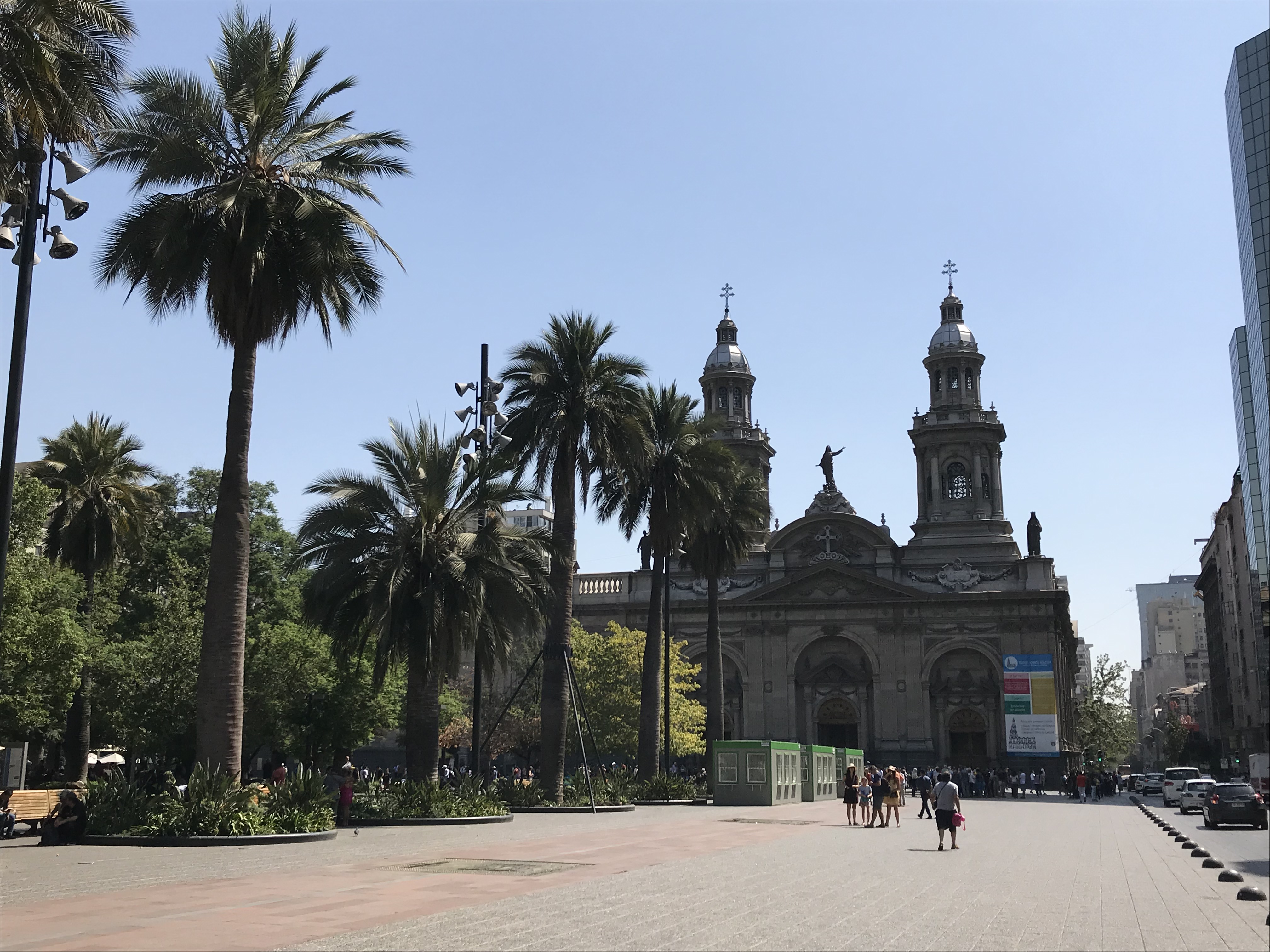 Nach dem Besuch der Markthalle spazieren wir durch das Zentrum zum Plaza de Armas im historischen Mittelpunkt von Santiago de Chile. Der Platz ist seit der Gründung der Stadt deren politisches, soziales, wirtschaftliches und religiöses Zentrum. Die Westseite der Plaza war schon immer kirchlichen Funktionen vorbehalten. Hier befindet sich die Kathedrale, die Sagrario-Kapelle und der Palast des Erzbischofs. Die Süd- und Ostseite der Plaza werden traditionall gewerblich genutzt. Die Nordseite ist der weltlichen Macht zugeordnet. Hier befinden sich das Cabildo, der ehemalige Königspalast "Palacio de la Real Audiencia", der jetzt das National History Museum beherbergt, und das Hauptpostamt.