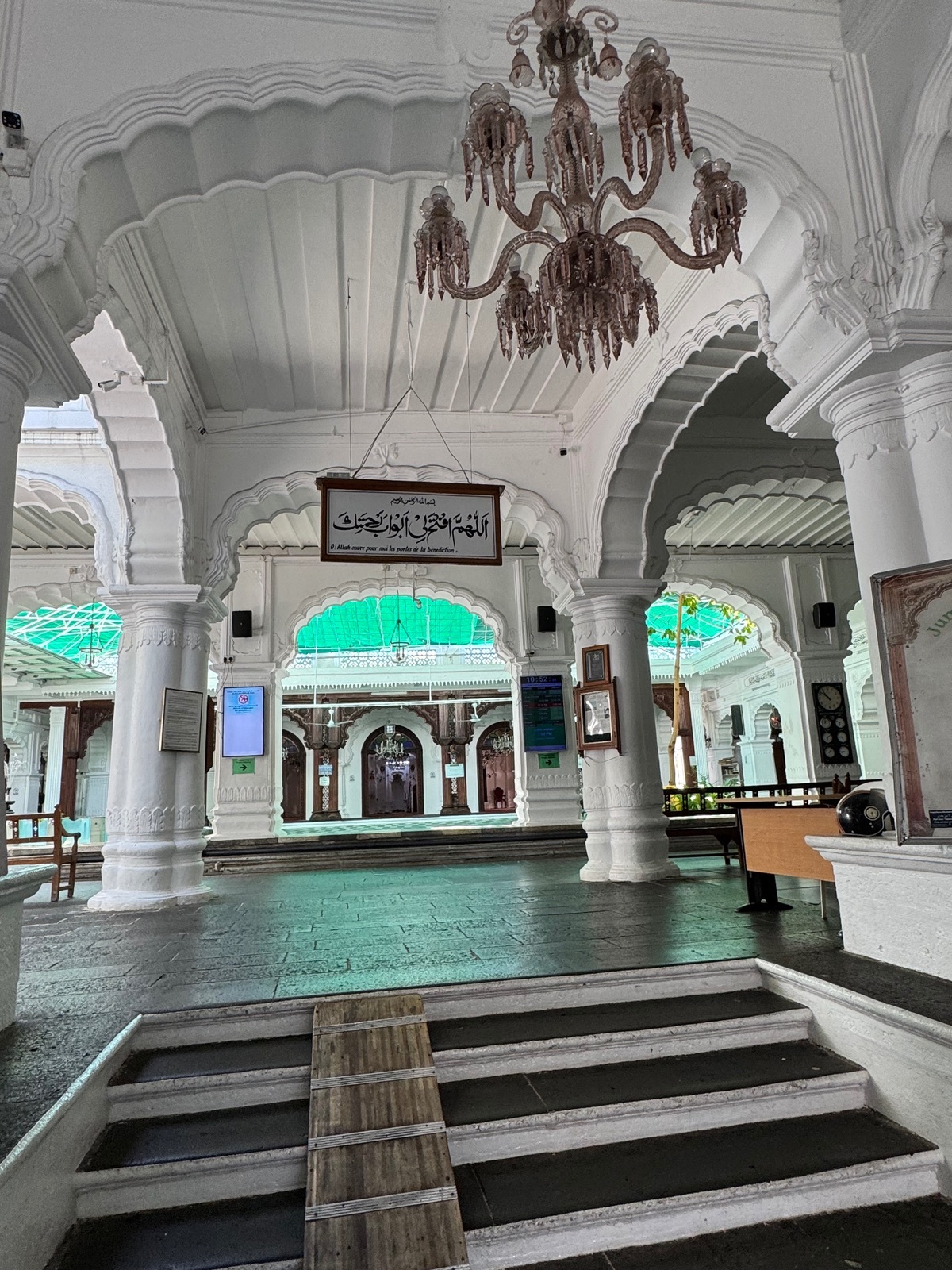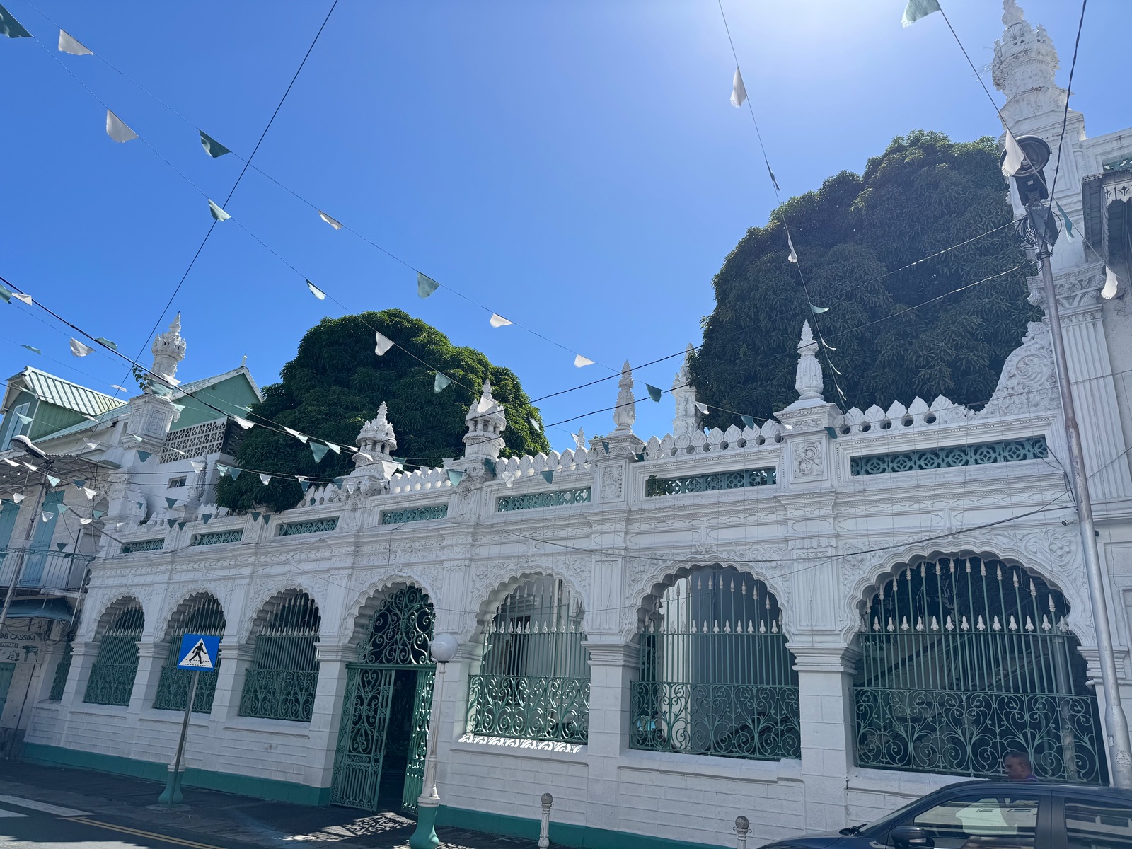 Der Architekturstil dieser Moschee ist eine Mischung aus indisch, kreolisch und islamisch und sie ist bekannt für ihre weiß-türkisfarbene Fassade.