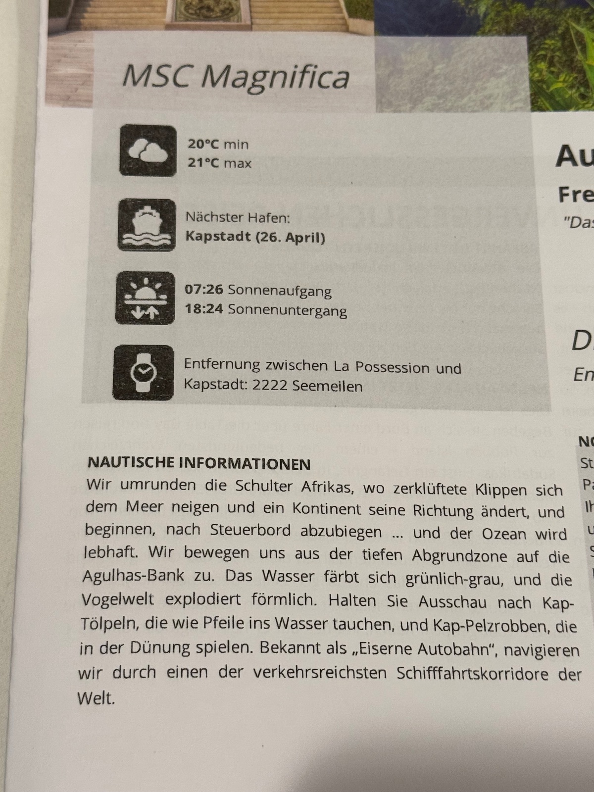 Es ist unser 110. Reisetag und rückblickend dürfen wir mit den Reisebedingungen auf dem Weltmeer wirklich sehr zufrieden sein.