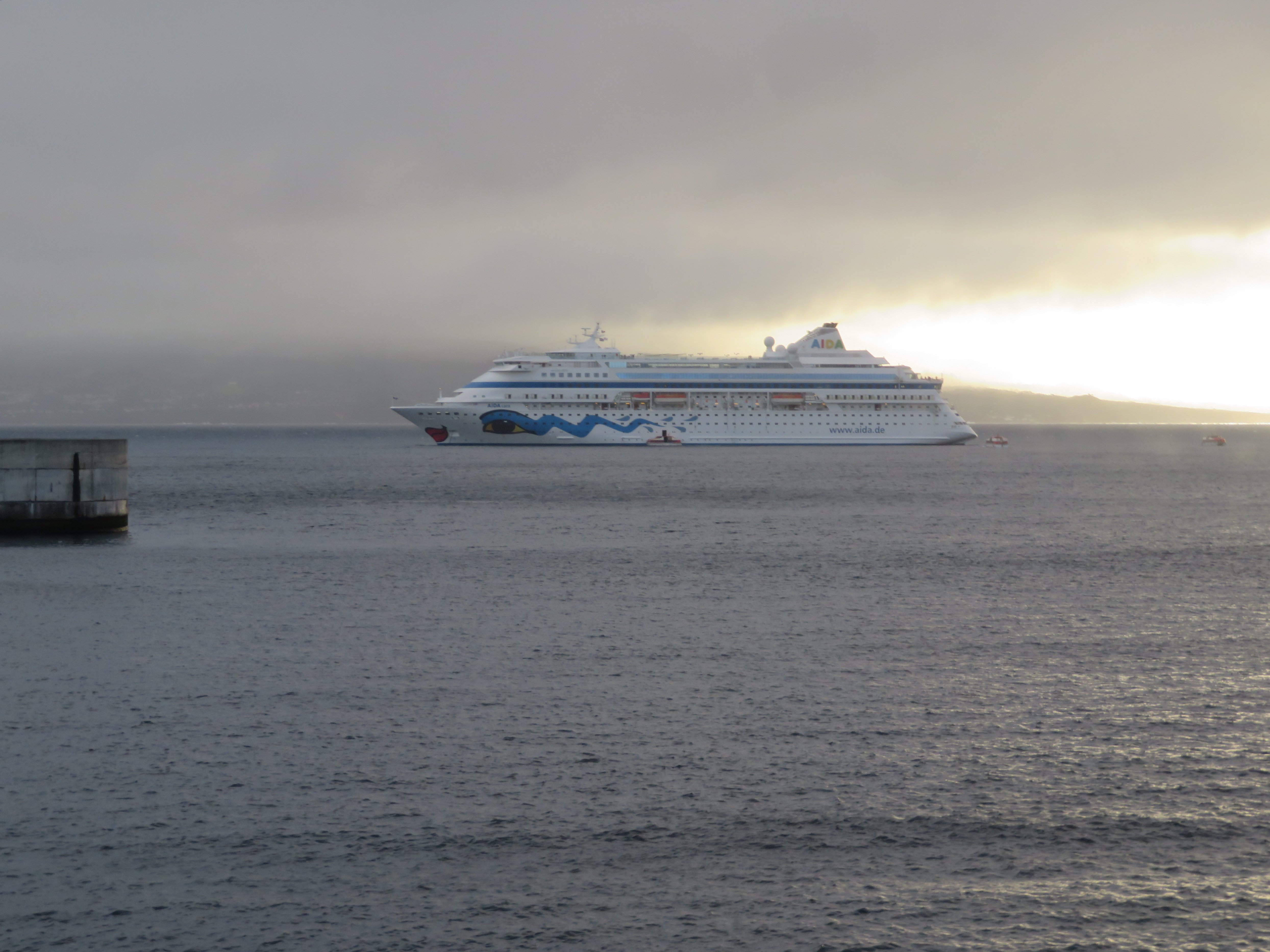 Aber noch ist kein Land in Sicht. Wir legen planmäßig erst um 9 Uhr an. Heute breche ich mit der Tradition. Es gibt keinen frühen Kaffee aus der Maschine und die Runde ums Deck verschiebe ich auch. Dafür gehe ich gleich zum Frühstück. Das Marktrestaurant hat gerade geöffnet. Gut gestärkt für den Tag komme ich rechtzeitig zurück, um das Einlaufen zu verfolgen und die ersten Fotos zu machen. Dann muss ich auch schon zum Ausflug. Meine Tasche habe ich bereits gestern Abend gepackt. Ich gehe also mit Fotoapparat auf Deck 6 uns stelle fest: Die Cara fährt nicht. Zunächst denke ich mir nichts dabei. Schiffe stoppen öfter mal kurz vor dem Hafen, weil der Lotse noch nicht an Bord ist. Vielleicht ist er gerade auf dem Weg zu uns. Während ich warte hole ich meine morgendlichen Runden nach. Ein Lotse ist nicht in Sicht, die Cara hat noch immer keine Fahrt aufgenommen und der Hafen ist in greifbarer Nähe. Es ist zwar kein schlechtes Wetter aber zu der frühen Stunde noch recht frisch. Ich kann ebenso gut in der Kabine warten. Inzwischen ist mir auch klar: Irgendetwas ist nicht so, wie es sein sollte. Mir fällt ein, dass bei ein oder zwei Reisen vor uns auch der Anlauf auf Horta abgebrochen wurde. Bitte nicht! Kaum gedacht ist auch schon der Kapitän in meiner Kabine. Ja gut, nicht er selbst, sondern seine Stimme. Liebe Gäste, es ist jetzt 8.35. Wir können auf Grund der Windverhältnisse leider nicht in den Hafen von Horta einlaufen ……. aber …… wir bereiten derzeit einen Tenderservice für sie vor.