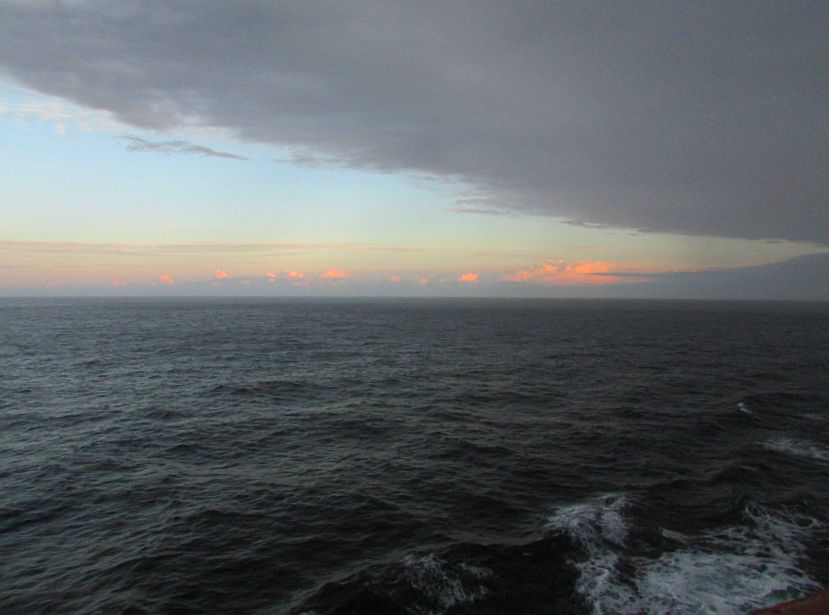 Gegen 06:00 Uhr: Die Sonne geht heute auf der Backbordseite auf, wenn sie durch die vielen Wolken überhaupt zu sehen ist. Der Horizont mit den rosé-orange angestrahlten "Schlagsahnewolken" sieht ja noch vielversprechend aus.